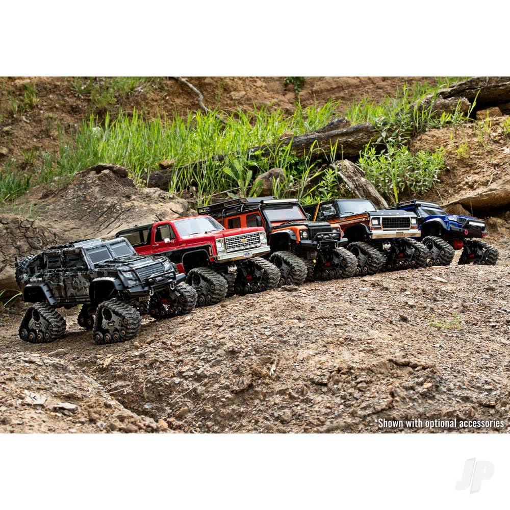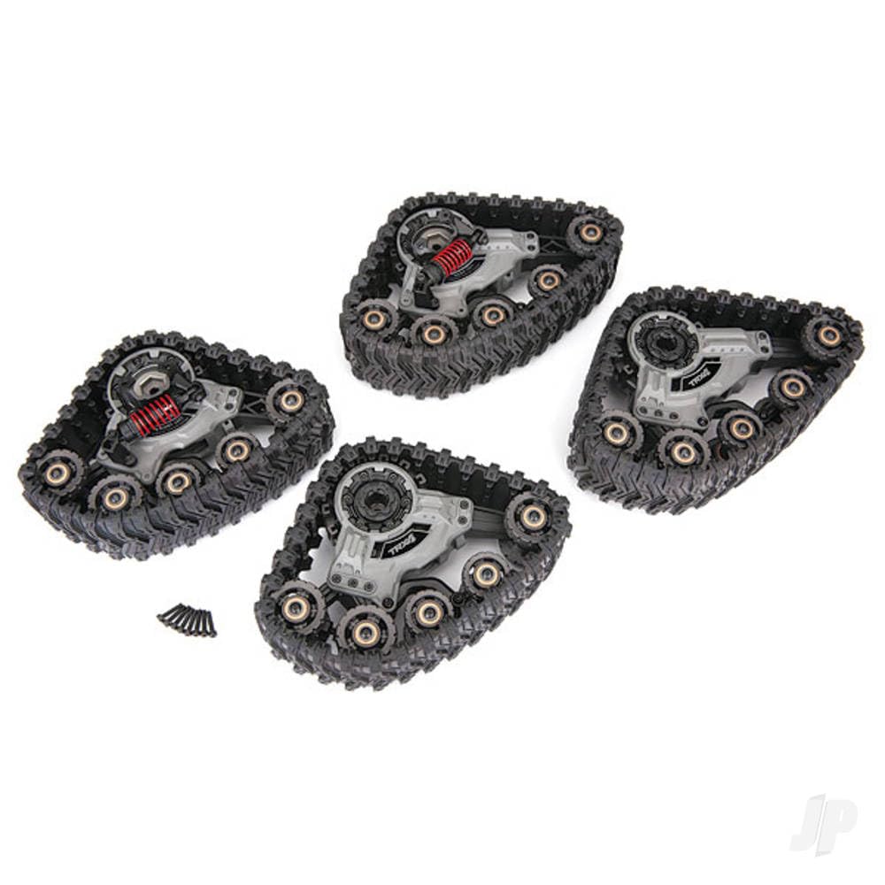 This is the Traxxas TRX-4 All Terrain Traxx, Complete Set Front and RearFeatures: Virtually unstoppable traction on practically any terrain including mud, sand, and even snow Fully-assembled for installation in just minutes Oil-filled coilover dampers to control rotational movement Suspended road wheels allow treads to conform to irregular surfaces Traxx adds over 16 mm of ground clearance compared to 1.9 wheels and tires and over 8 mm more than 2.2'' wheels Functions similar to portal weights, carrying the bulk of the weight down low for improved stability Effectively lengthens the wheelbase while increasing the breakover angle which adds stability while ascending steep slopes. Specially designed one-piece rubber treads resist de-tracking Drastically improves ground clearance and approach angles Designed for all-weather fun Sealed bearings on drive wheels Low-maintenance self-lubricating bushings on guide wheels Longer rear Traxx drive units for steep climbing stability Re-usable molded foam storage box Fits all TRX-4 modelsIncludes: (4) TraxxRequires: TRX4 VehicleThis product is compatible with the following Model(s): Traxxas TRX-4