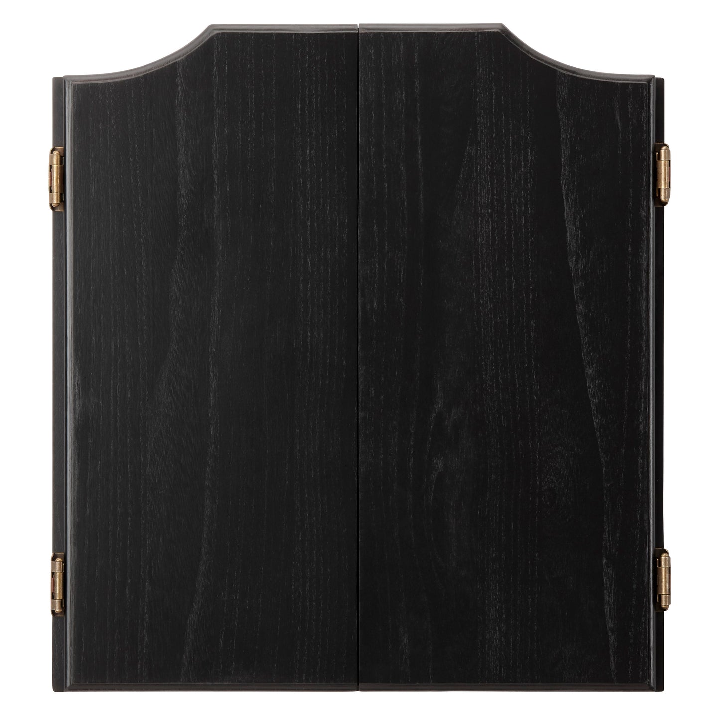 Complete the classic look of your game room with the Hudson Dartboard Cabinet, constructed from 100% solid pine. The construction quality in this cabinet is top notch, using box joints and self-closing brushed nickel hinges. The mahogany or black finish of this cabinet goes with any traditional decor, but will not look out of place in a more modern or transitional scheme. Built directly into the cabinet doors are a convenient Cricket scoreboard with dry erase marker and a handy out-chart gives you the surest path to victory. This cabinet also has convenient dart storage, so youll never need to worry about losing your equipment. Youll hang your cabinet with easy-to-use mounting hardware and complete your game room with the Hudson Dartboard Cabinet.