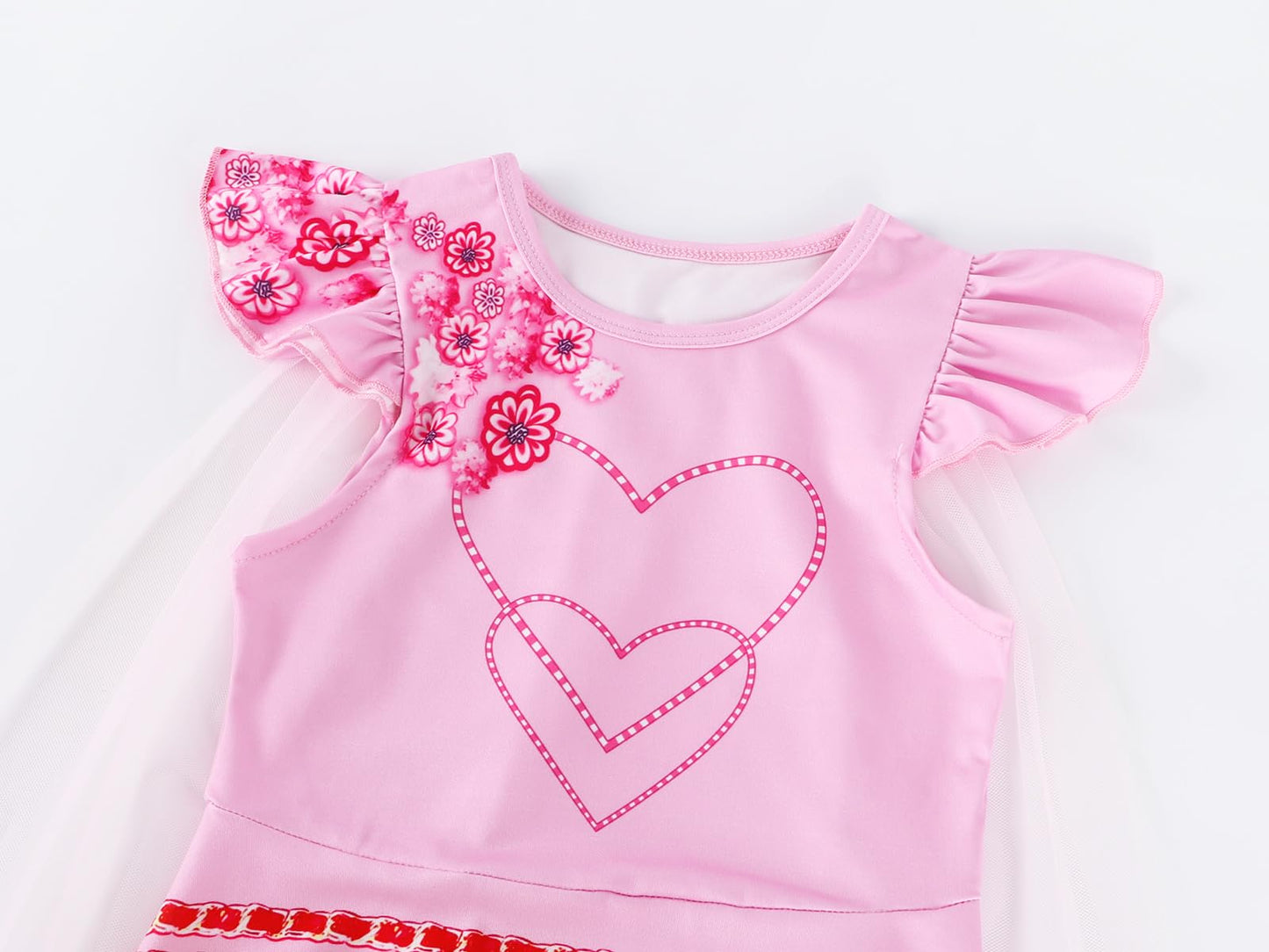 Transform your little girl into the magical Princess Bridget from Descendants with this enchanting costume dress. Crafted from a soft, breathable polyester blend, this pink dress features a cute heart pattern, a round neckline, and short sleeves, ensuring comfort and ease of movement. Perfect for Halloween, birthdays, or everyday play, this dress is available in sizes 3t to 12 years, making it suitable for little girls of all ages. The dress is easy to wear with a pull-on closure and requires hand washing only for care.