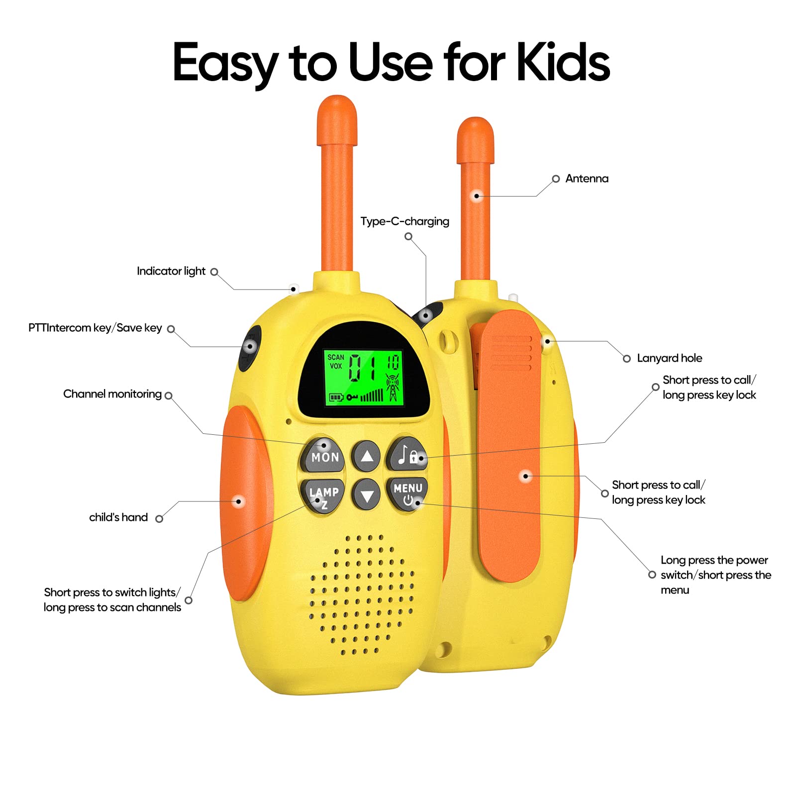 - Q: What age group are these walkie talkies suitable for? A: These walkie talkies are designed for children aged 3 to 12 years, featuring an easy-to-use left-hand 'PTT' push-to-talk operation that is accessible for young users.
