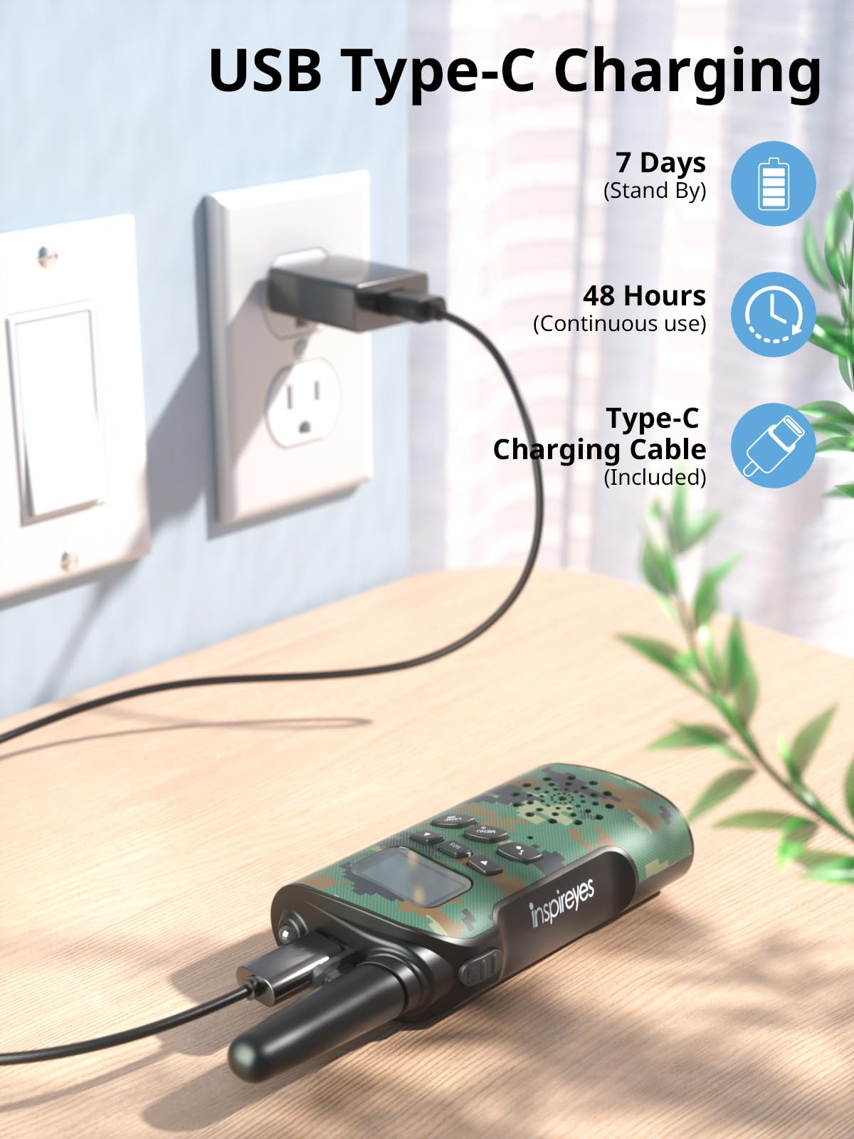 - Q: How long does the battery last on the Inspireyes Walkie Talkies? A: The Inspireyes Walkie Talkies feature a rechargeable lithium polymer battery that provides up to 48 hours of working time and 7 days of standby, making them ideal for extended outdoor activities.