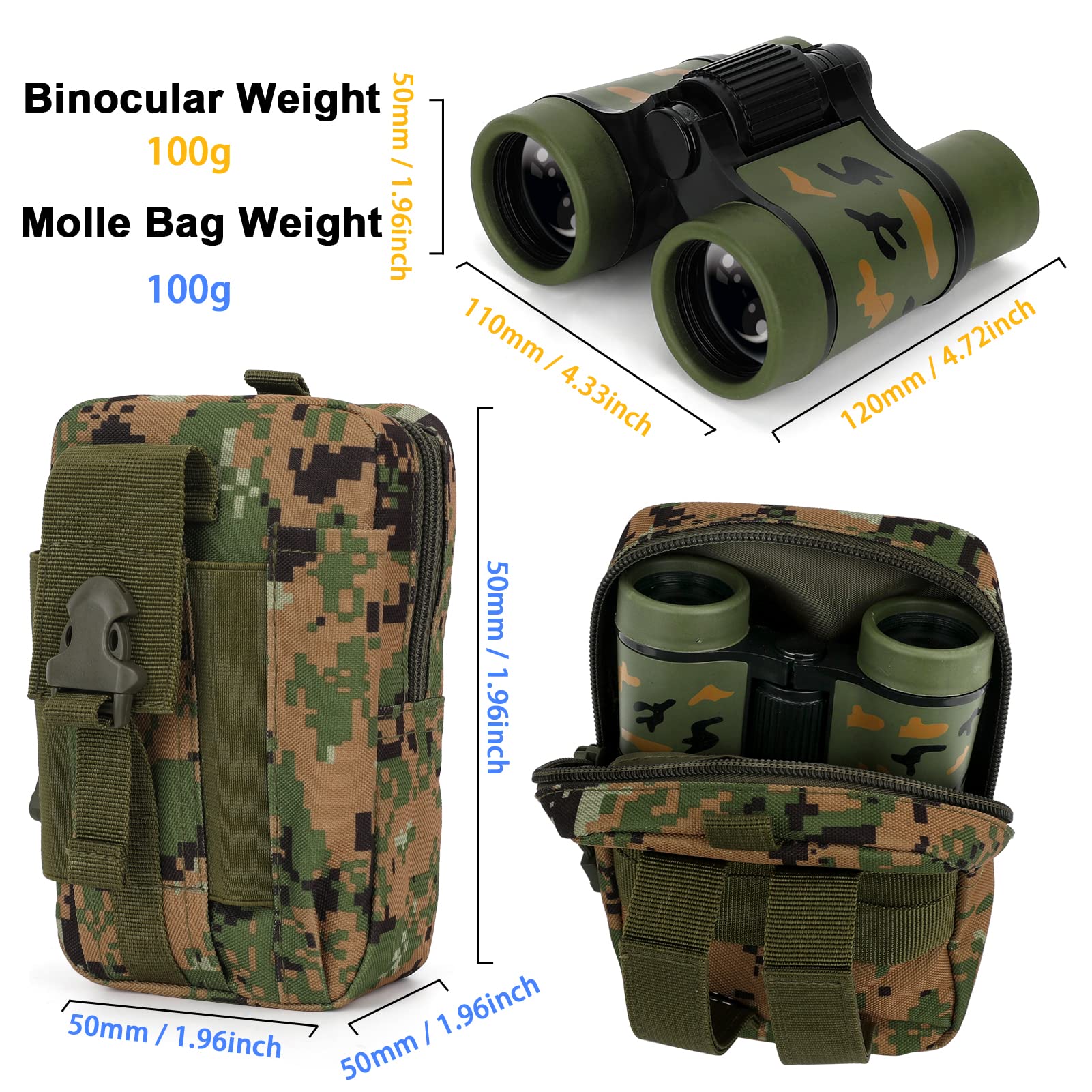 - Q: What additional items come with the walkie talkies? A: The package includes two kids walkie talkies, two lanyards, a pair of binoculars, a molle pouch, and a user manual, providing everything needed for outdoor adventures.