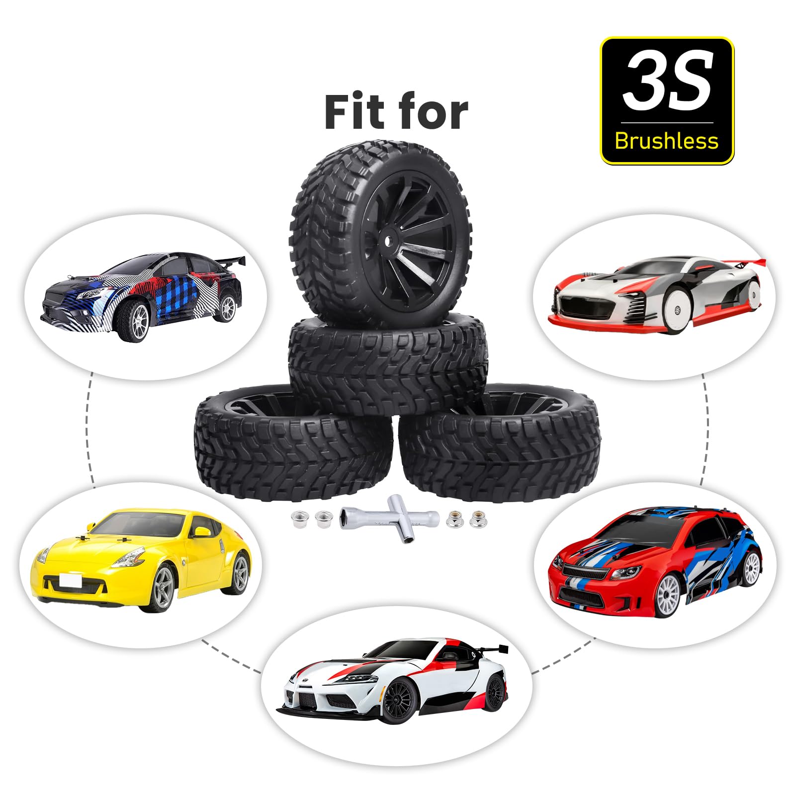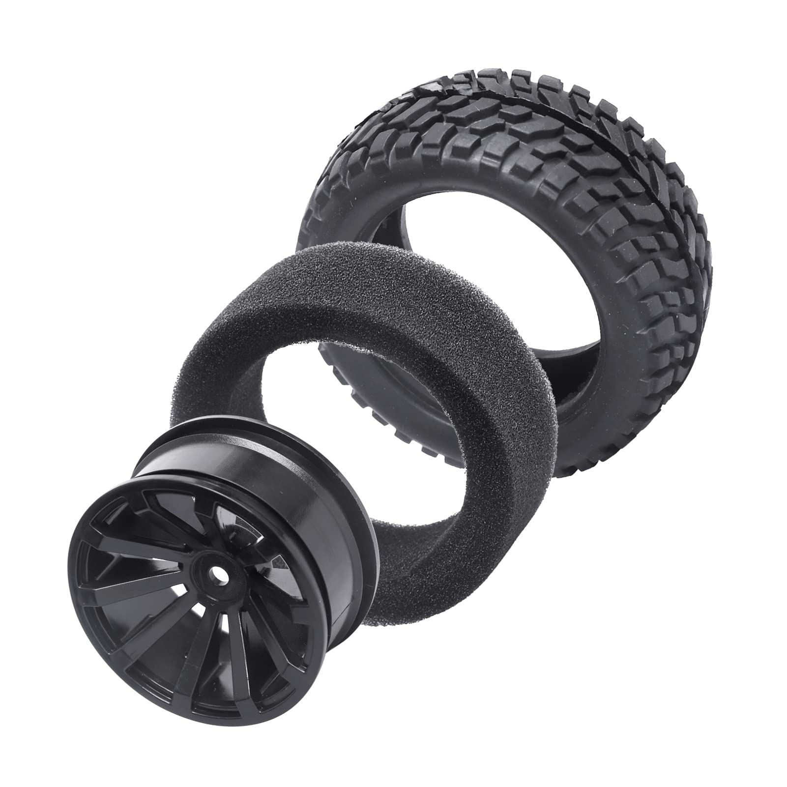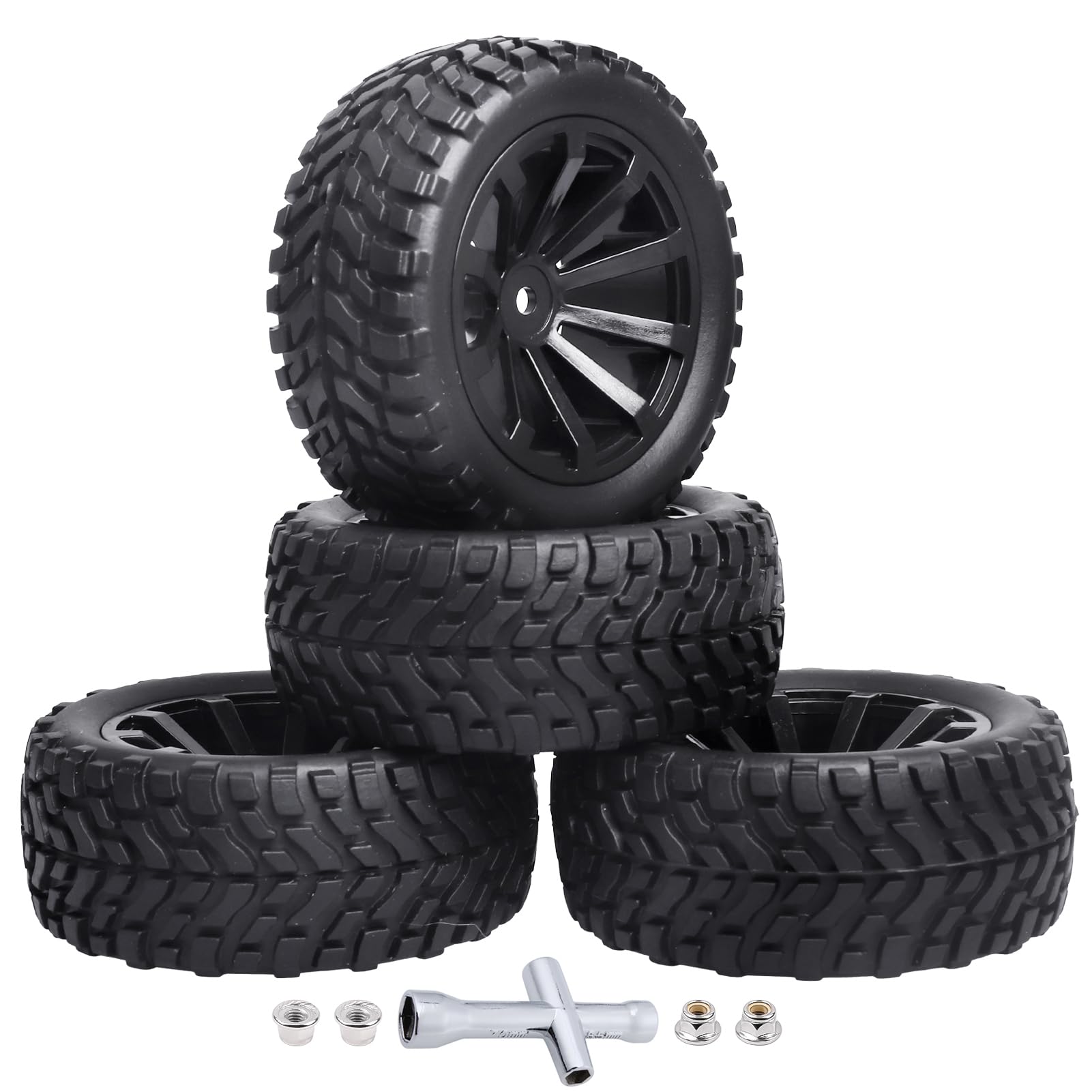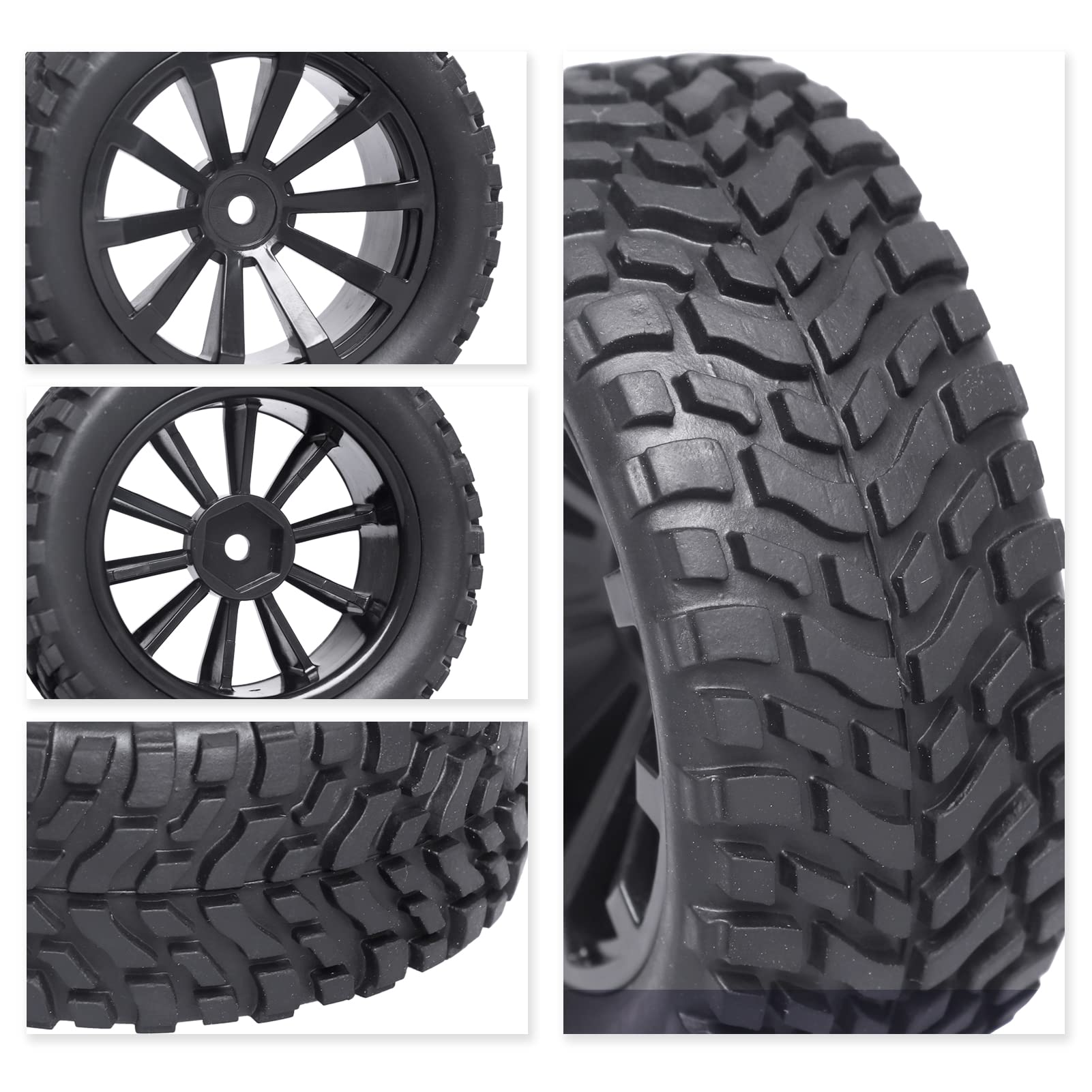 - Q: What are the dimensions of the tires and wheels? A: The tires have an outer diameter of 2.99 inches (76mm) and a width of 1.18 inches (30mm). The wheel rims feature an inner diameter of 1.81 inches (46mm) and a 12mm hex drive hub with a 4mm axle hole.