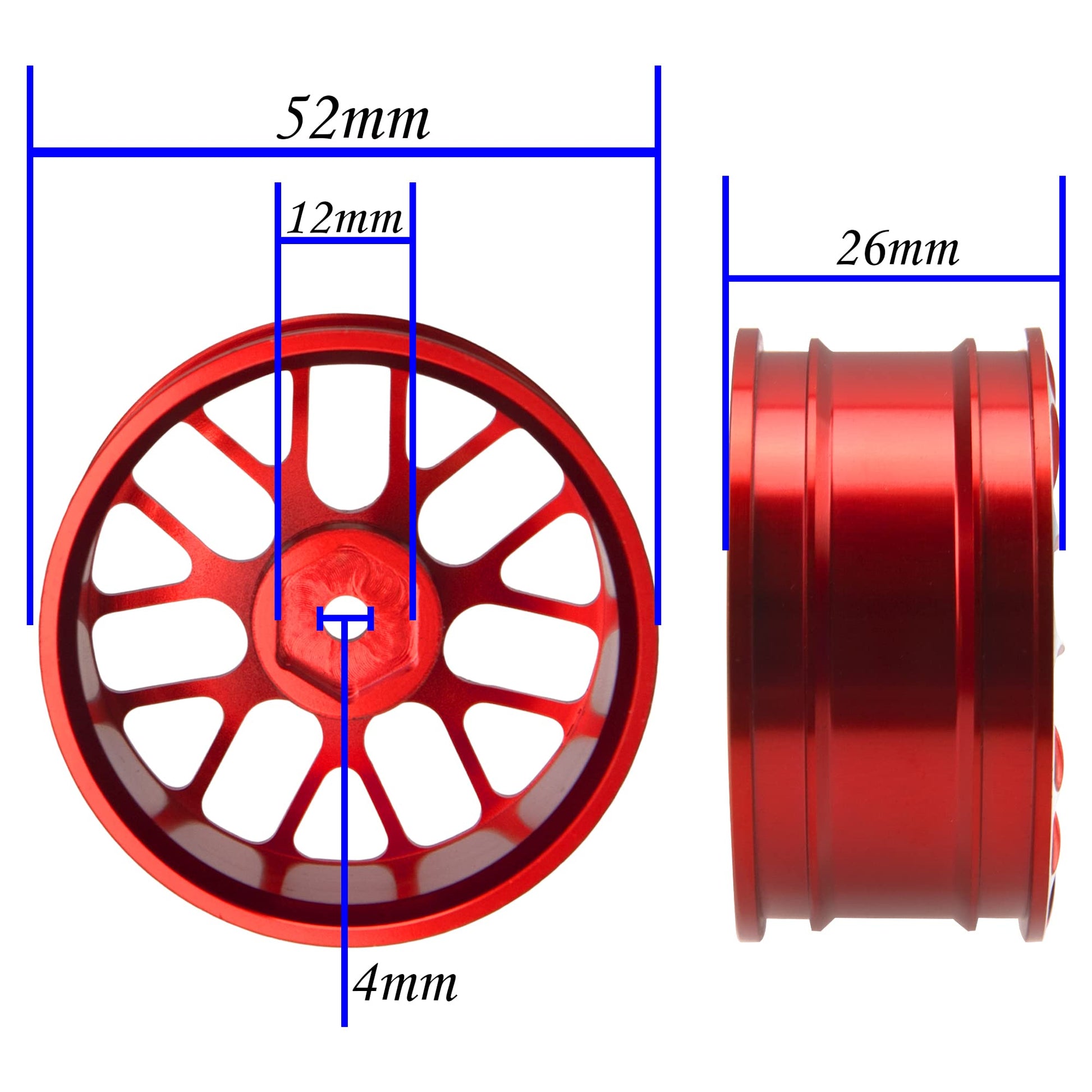 - Q: What are the dimensions and specifications of the wheel rims? A: These wheel rims have a width of 26mm (1.02 inches), an outer diameter of 52mm (2.04 inches), a hex size of 12mm, and an axle hole diameter of 4mm. They are designed to fit 1/10 scale RC cars and accommodate both plastic and rubber tires.