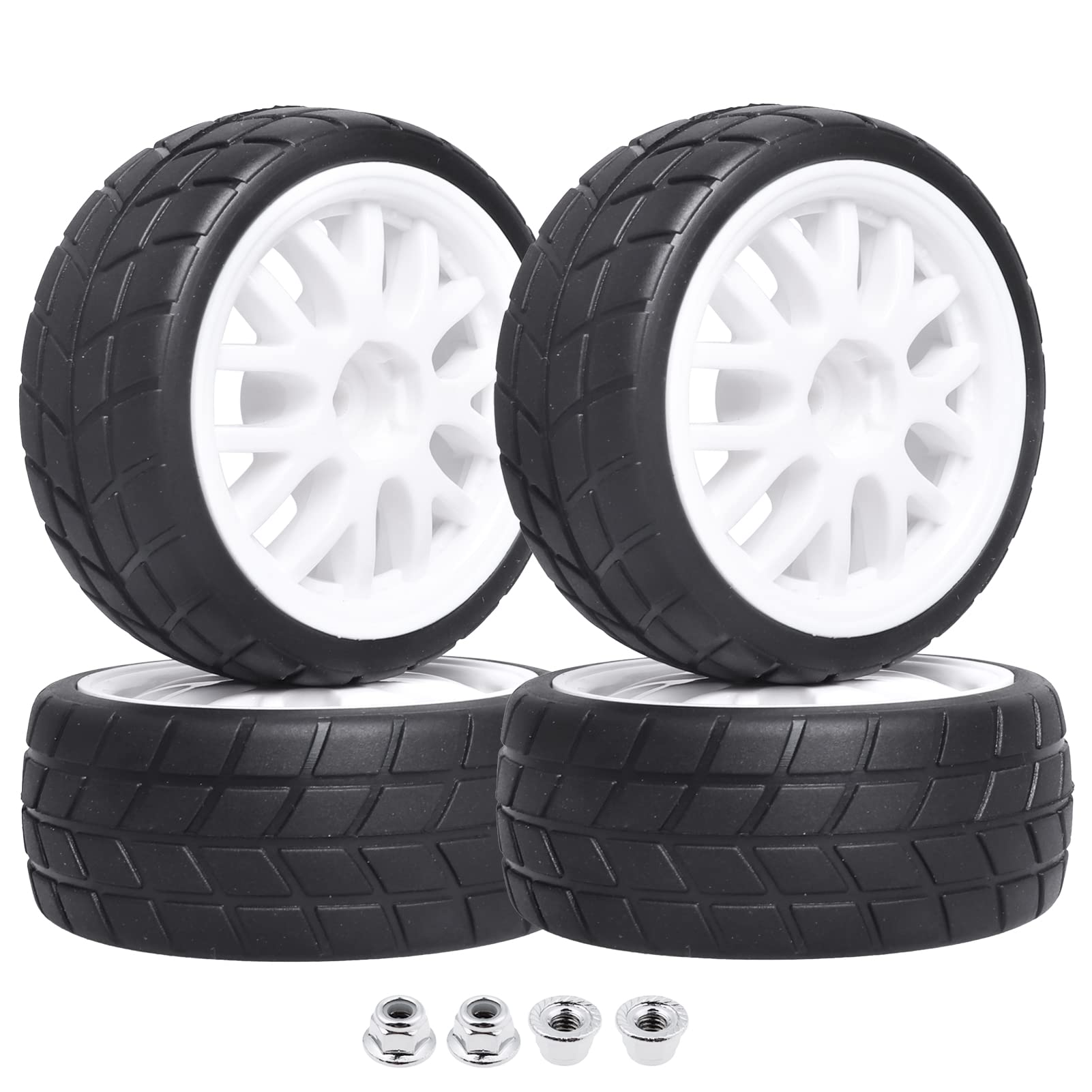 Item: 1/10 Scale On-Road Tires & Wheel Rim Package Include: 4x Tires & Wheels Rim Complete 4x Nylon Lock Nut M4 (Note: The tire is not glued on rim. It's mounted on rim with foam inserted) Features: Tire Material: Soft Rubber; Wheel Rim Material : Plastic Tires Outside Diameter: 2.55''(65mm) Width: 1.02'' (26mm) Drive Hex: 12mm (Not Included) Wheel Rim Diameter:2.05''(52mm) Wheel Rim Axle hole: 4mm Standard Tire Sponge inserts Included Tires and Wheel Not Glued, can be split Compatibile with: 1/10 Scale On-Road Model Cars, such as HSP HPI Redcat,Himoto,Tamiya ,Exceed,AMAX and so on.Check the size in the features. Note: Tires and Wheel Not Glued, can be split.Check your specific model's manual for compatibility.