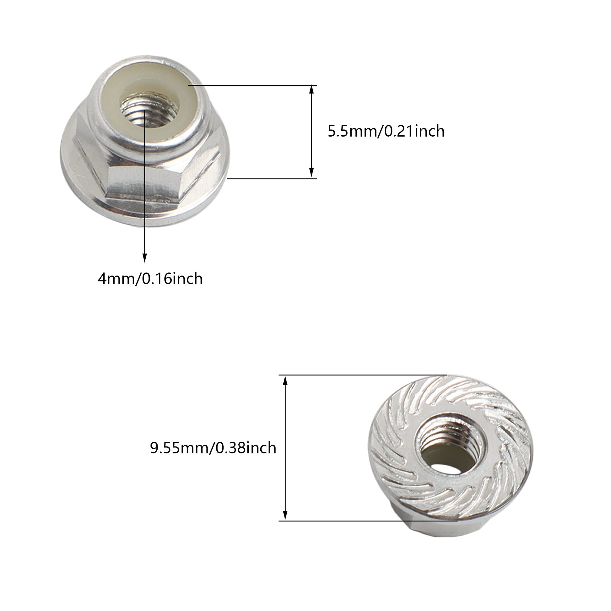 Here are the Reason Why Choose Our 4mm Wheel Lock Nuts? Made of high-quality aluminum alloy material, the surface is anodized, corrosion-resistant, prolonged service life and more durable.100% brand new. CNC precision machining, the base of Serrated threads is clean and smooth. Increased strength and precision. Easy upgrade from the original part. The nylon inserts ensure your wheels stay connected to the vehicle under the harshest conditions. Compatible with: RC Models Cars, FPV Drone, Aircraft, etc.Features: Hex:7mm Thickness:5.5mm Hole Diameter: 4mm Outside Base Diameter: 9mm Material: aluminum alloy; NylonPackage Include: 8PCS M4 Lock Nuts Color: Silver