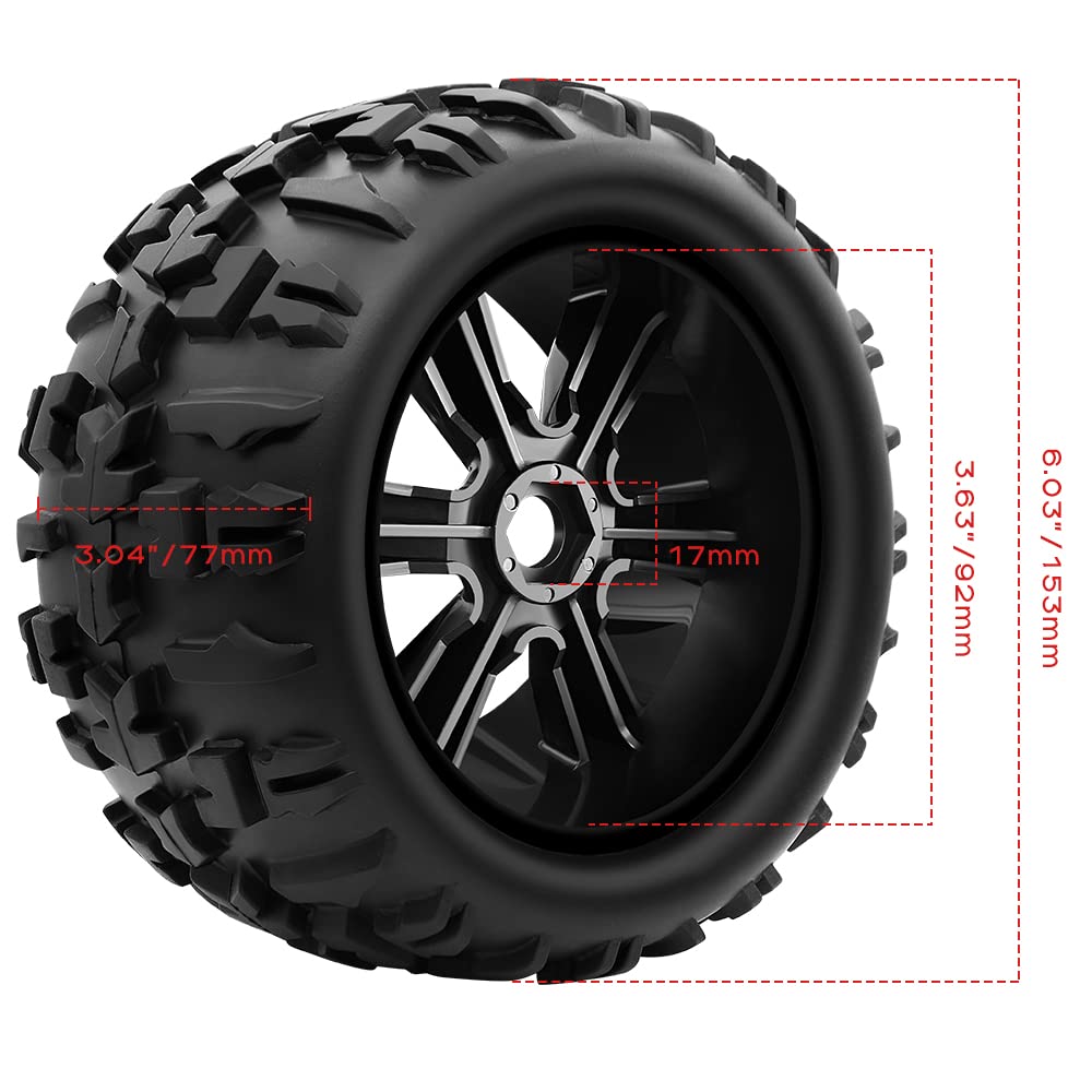 - Size Precision: The dimensions of these wheels and tires are meticulously designed to achieve optimal performance. Outer Diameter is 6/154 mm, Inner Diameter is 3.63/92mm, Width is 3.1/78mm, and Hex Size is 17mm.