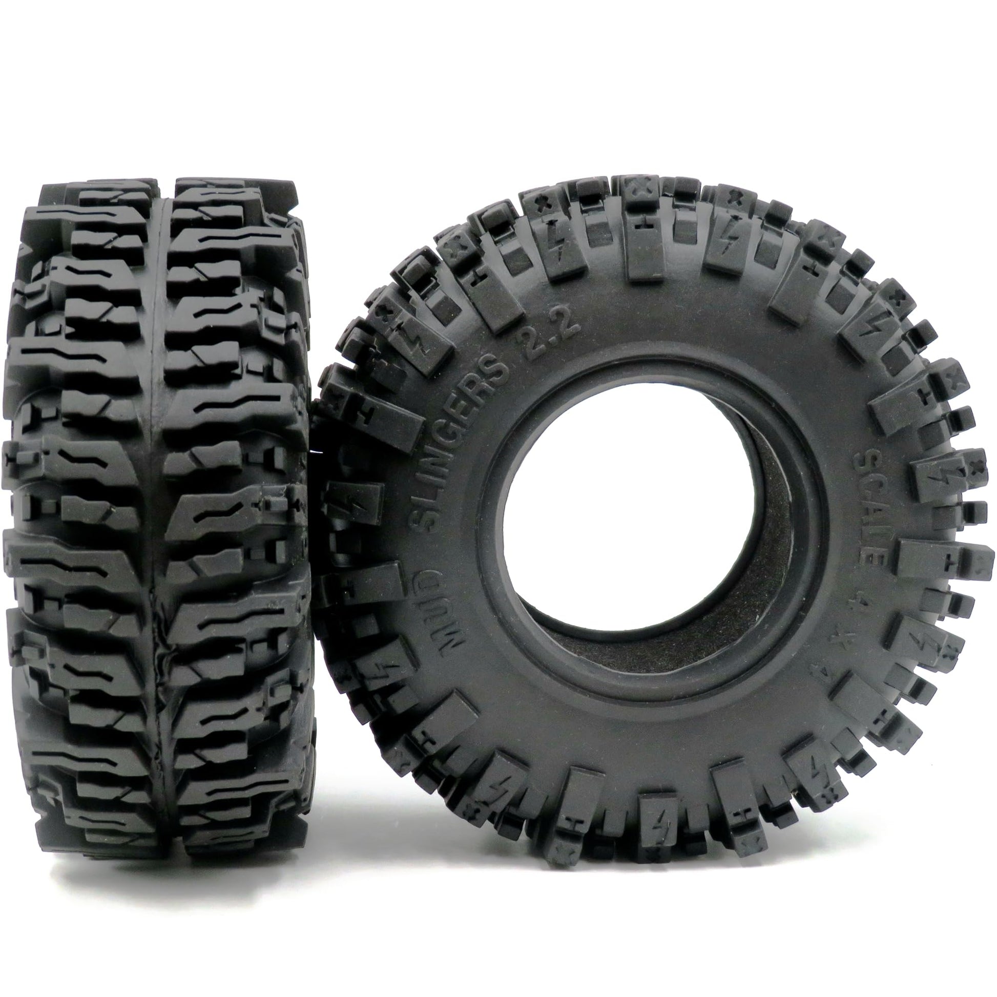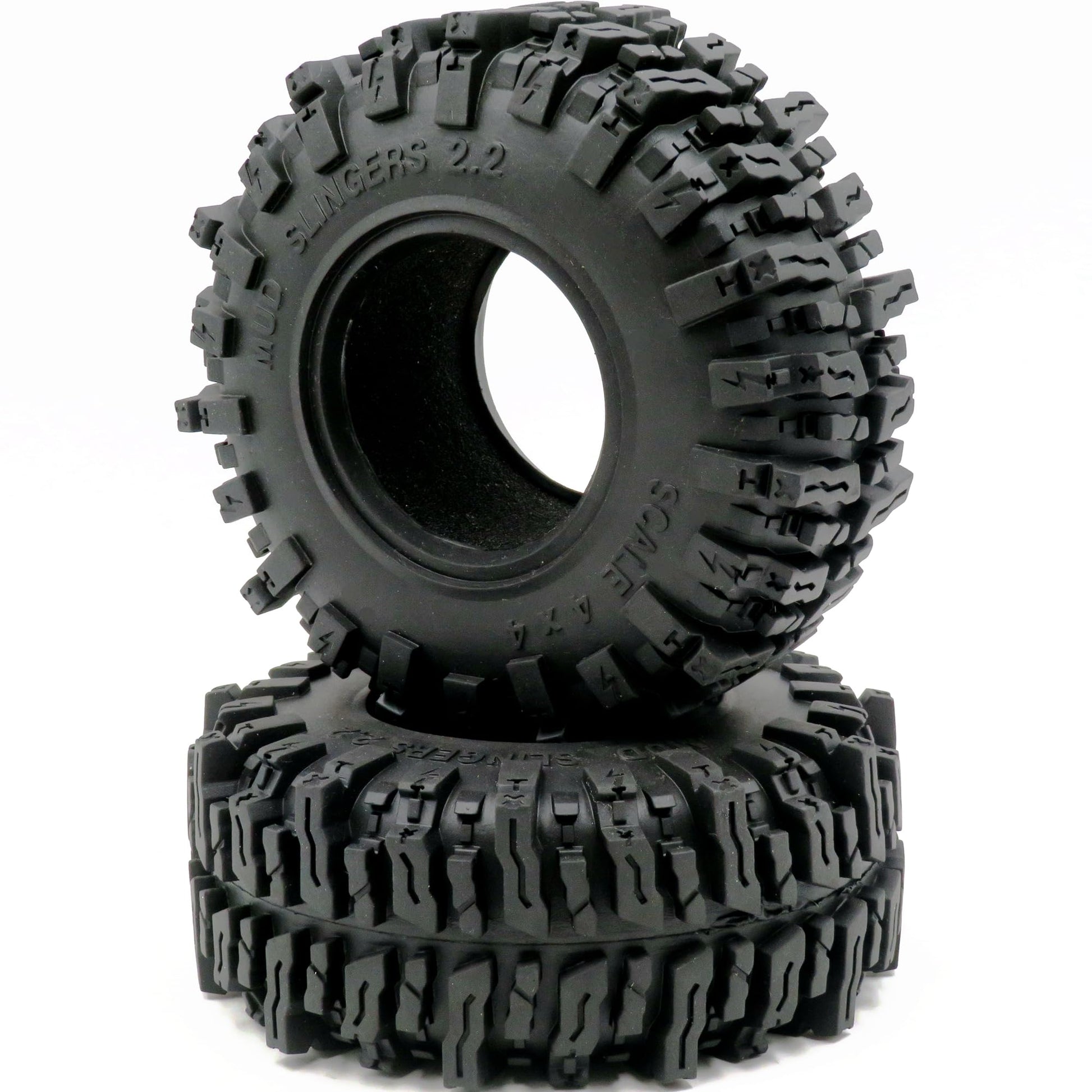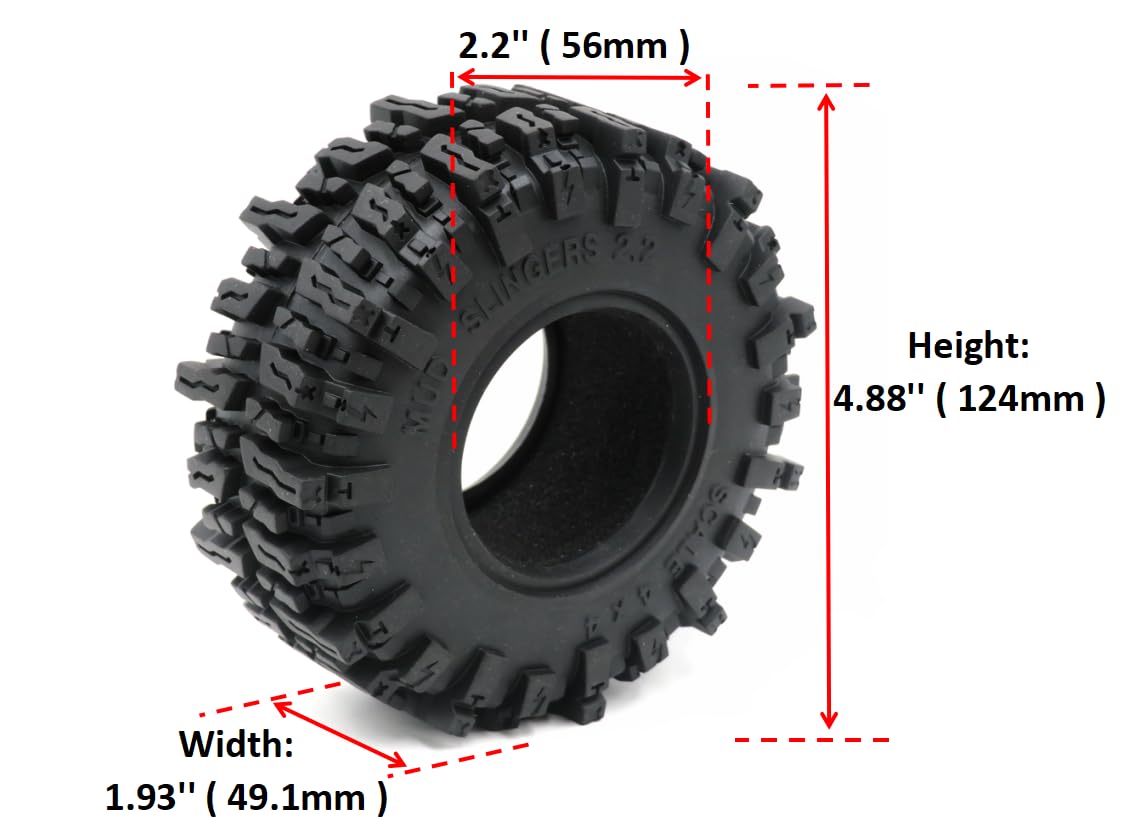 This new released high quality crawler rubber tires OD 124mm are designed for 2.2'' Alloy Beadlock Rims 1/10 electric powered or gas powered for rc crawlers like axial, scx10, rc 4wd, cc01, etc. Description Outer diameter: 124mm ( 4.88 inch ) Inner Diameter: 56mm (2.2 inch) Wide: 49.1 mm ( 1.93 inch ) Contain: 2pcs 2.2 Mud Slingers Tyres With Foam insert Fit for RC Crawler Truck 2.2'' beadlock wheel rims