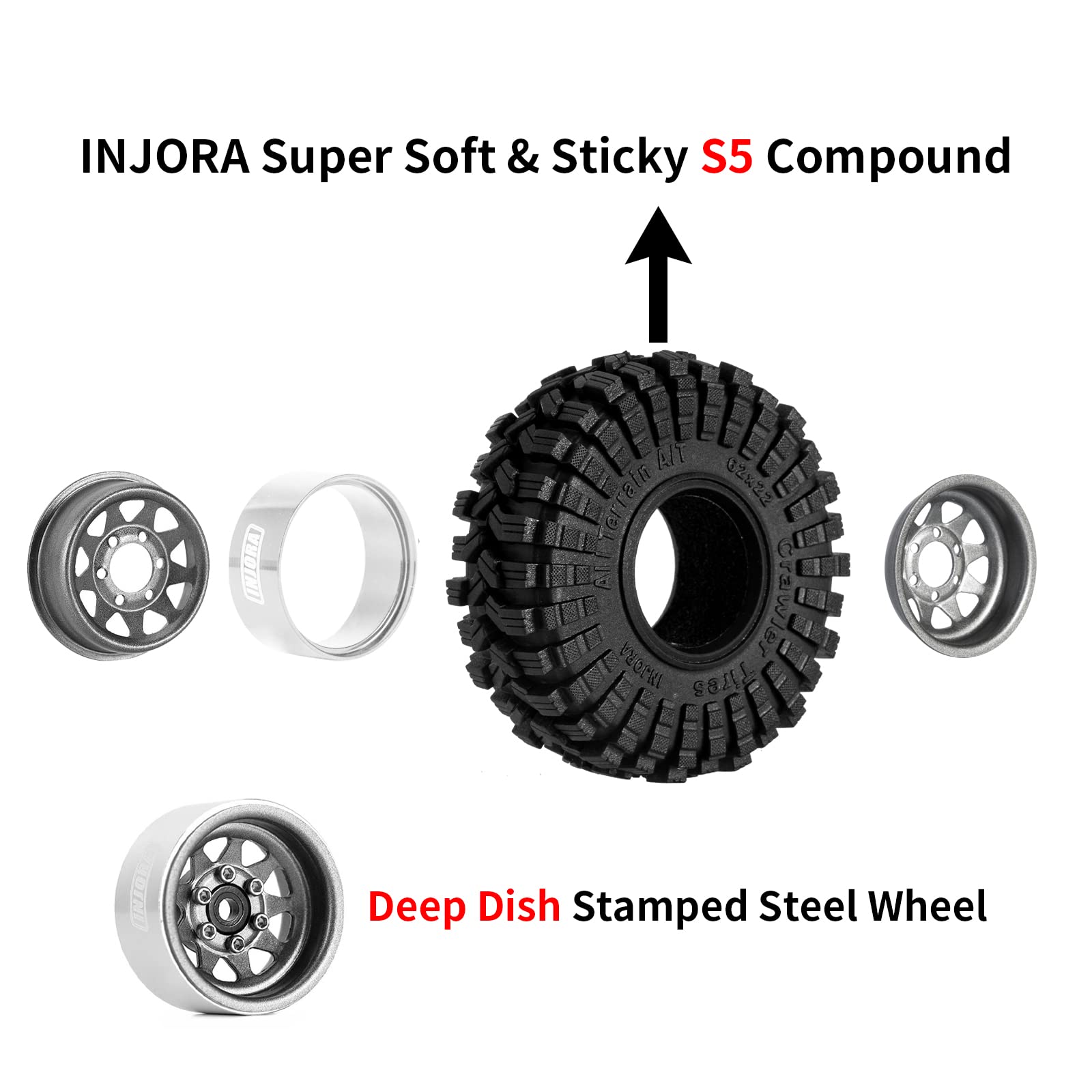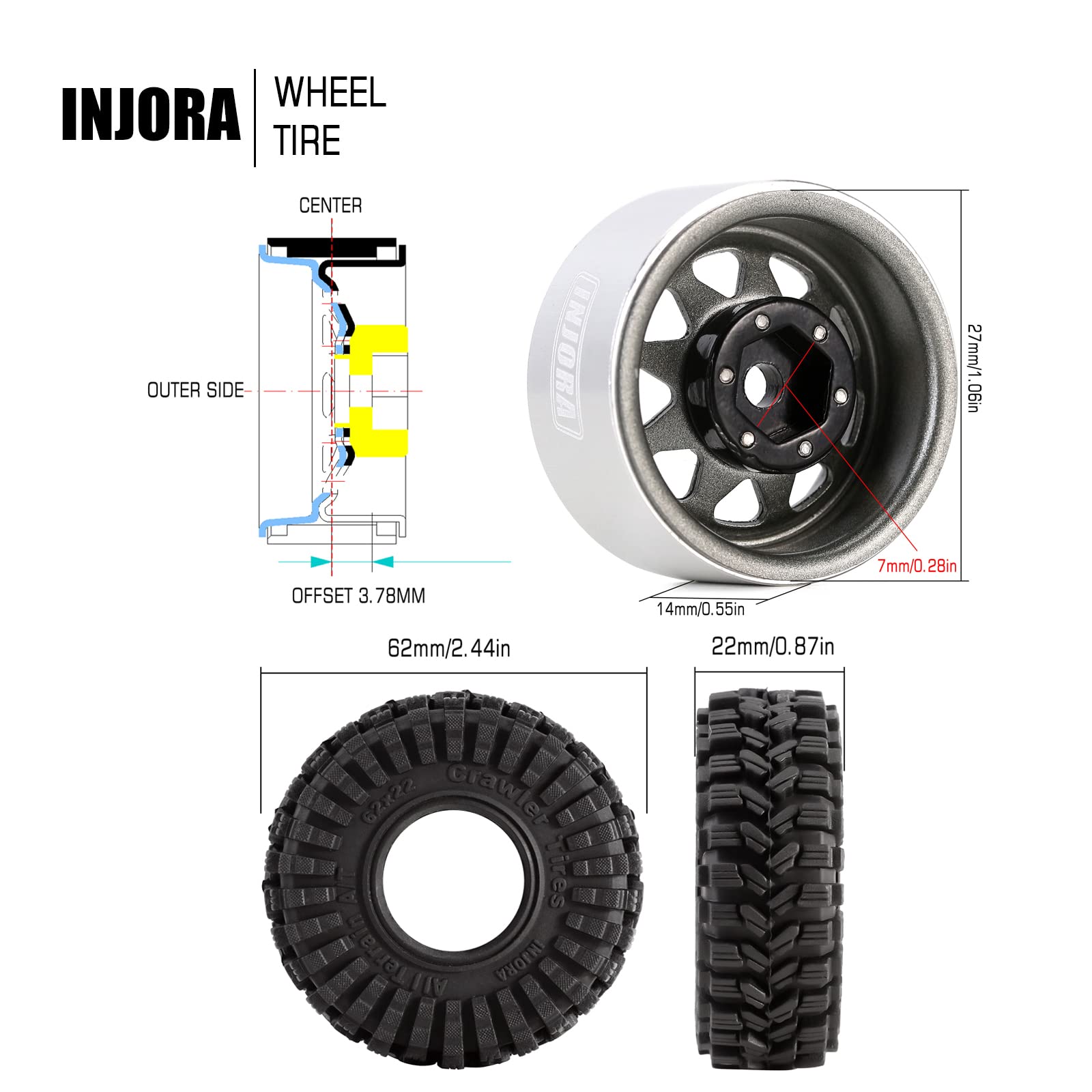 Rim Specifications: Part Number: W1004 Material: Steel Offset: -3.78mm (-0.15in) Outer Diameter: 27mm (1.06in) Width: 14mm (0.55in) Wheel Hub: 7mm (0.28in) Each Weight: 15g/pcs (0.53oz) Tire Specifications: Part Number: T1014 Compound: INJORA S5 (Super Soft & Sticky) Material: Rubber Outer Diameter: 62mm (2.44in) Width: 22mm (0.87in) Each Tire Weight: 15g (0.53oz) Package List: 4 * RC Car 1.0'' Rims 4 * RC Car 1.0'' Tires