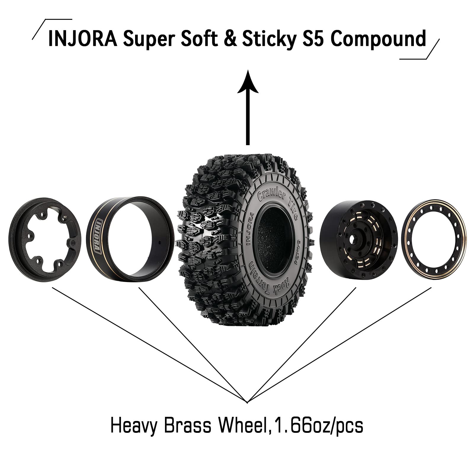 - Q: What materials are used in the construction of the INJORA tires and rims? A: The rims are made from high-quality brass, which provides durability and stability, while the tires are crafted from a super soft and sticky rubber compound known as INJORA S5, ensuring excellent traction and wear resistance.