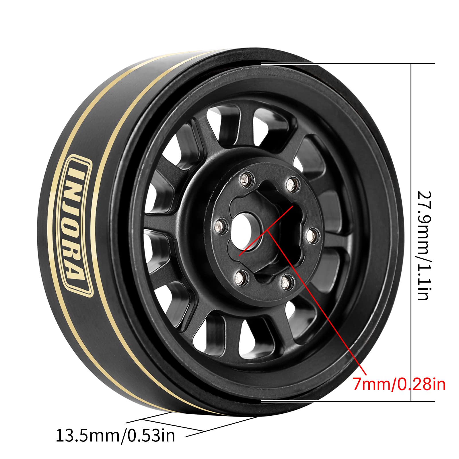 - Q: What are the dimensions and weight of the INJORA 1.0 Plus Brass Beadlock Wheel Rims? A: The INJORA 1.0 Plus Brass Beadlock Wheel Rims have an outer diameter of 27.9mm (1.1 inches) and a width of 13.5mm (0.53 inches). Each wheel rim weighs 42g (1.48oz).