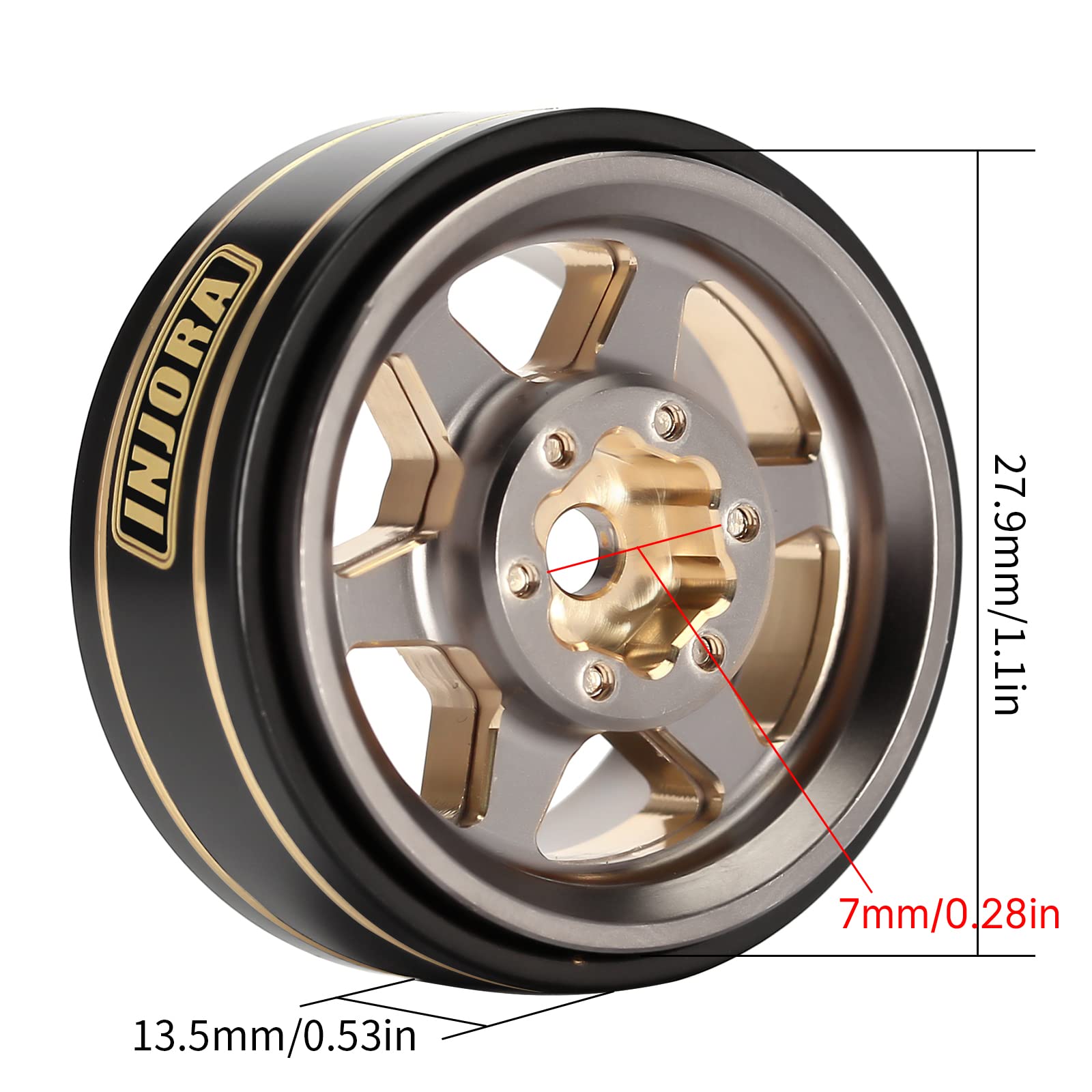 Specifications: Material: Brass Negative Offset: about 3mm Outer Diameter: 27.9mm (1.1in) Width: 13.5mm (0.53in) Wheel Hub: 7mm (0.28in) Each Weight: 42g/pcs (1.48oz) Package List: 4 * RC Car 1.0'' Plus Wheel Rim