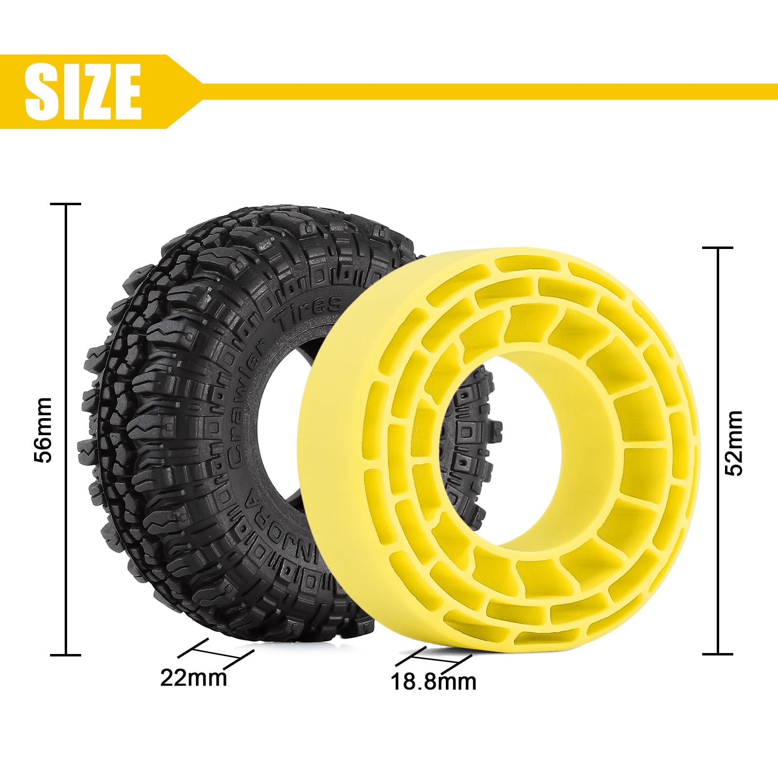 - Q: What are the dimensions of the INJORA 1.0 Silicone Rubber Inserts and S5 Rock Crawling Tires? A: The INJORA 1.0 tires have an outside diameter of 56mm (2.20 inches) and a width of 22mm (0.87 inches). The silicone rubber inserts measure 52mm by 18.8mm (2.05 inches by 0.74 inches).