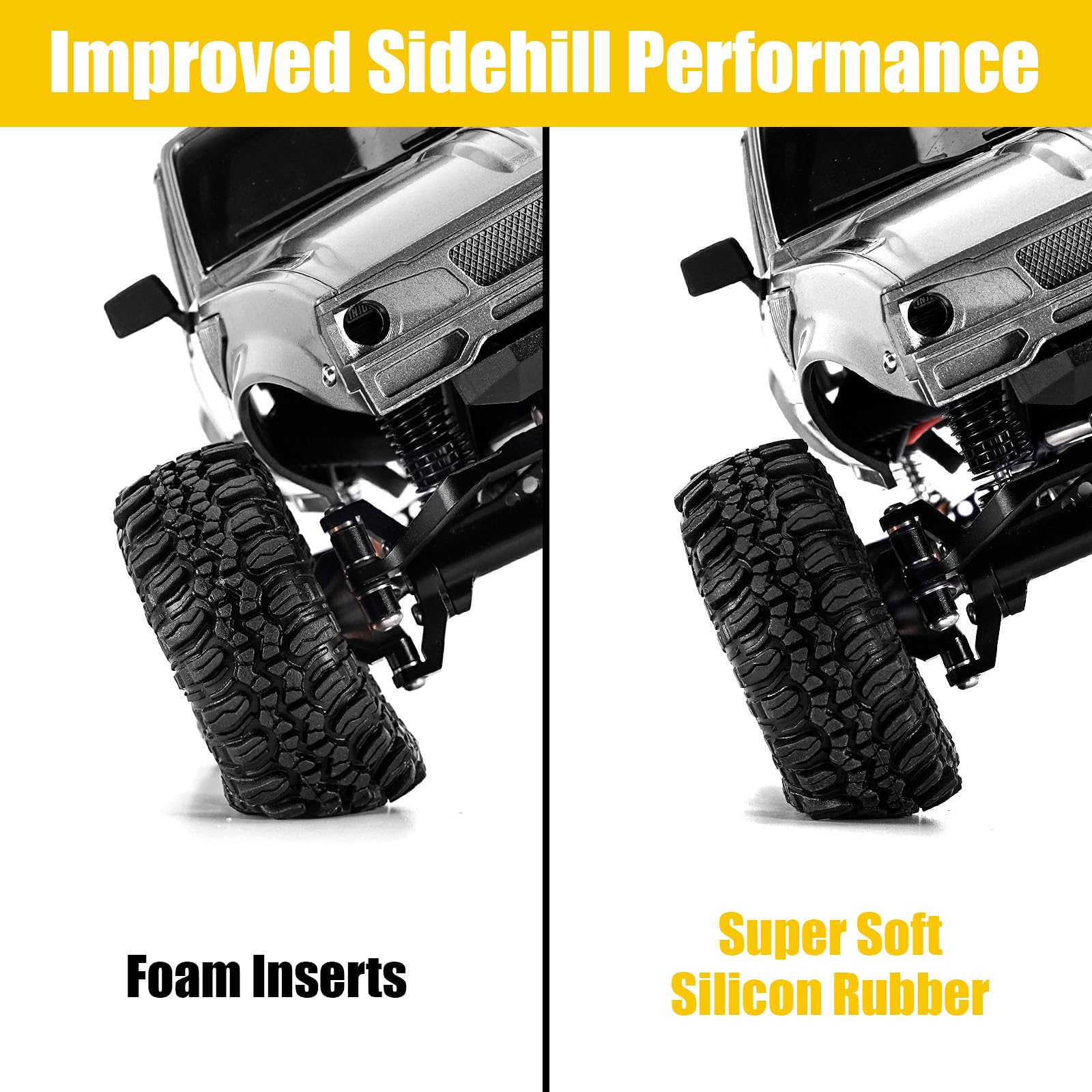 Note: Size may vary by 1-2mm due to manual measurement.Features:Designed to fit for 1.0inch wheel RC Crawler Axial SCX24Made of soft rubber, foam inserts includedLightweight upgrades, good grip and durabilityAggressive lugs and narrow, excellent performanceExtreme scale suitable for all terrainsTire Specifications:Material: RubberQuantity: 4pcsWeight: 11 g/piece (0.39 oz/piece)Outside diameter: 56mm/2.20 inchesWidth: 22mm/0.87 inchesSuitable for: RC Crawler Axial SCX24Insert Specifications: Material: Silicone Rubber Size: 52*18.8mm (2.05*0.74in) Weight: 11g/pcs Yellow Inserts: Super Soft Package List: 4 * 1.0'' RC car tires and 4 * Silicone Rubber Inserts