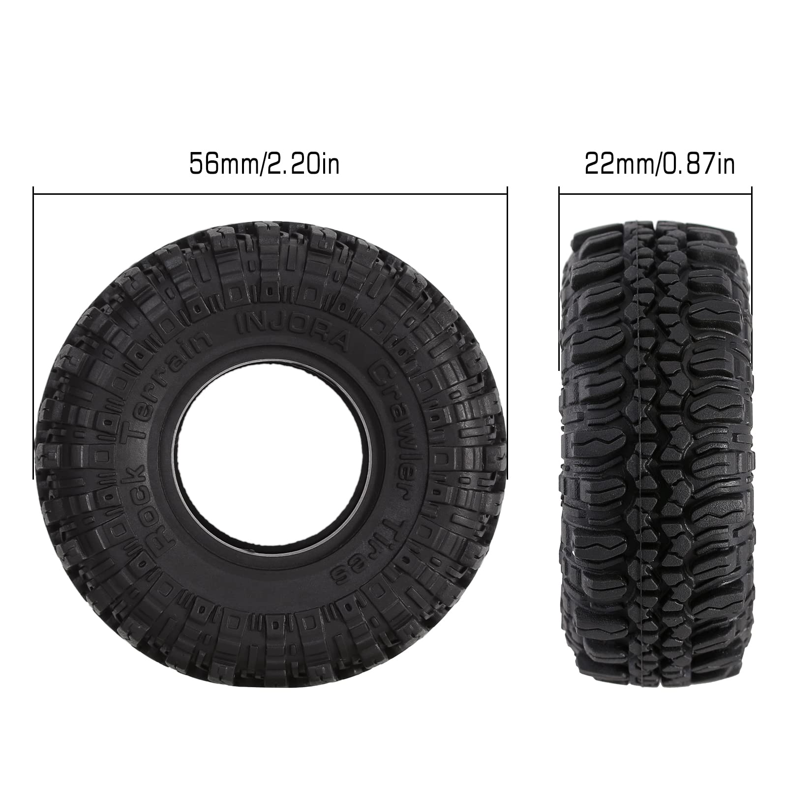 - Q: Can I use the INJORA 1.0 Tires for racing or speed runs? A: While the INJORA 1.0 Tires are primarily designed for rock crawling and off-road performance, their excellent grip and lightweight design may also provide adequate traction for casual racing on various surfaces.