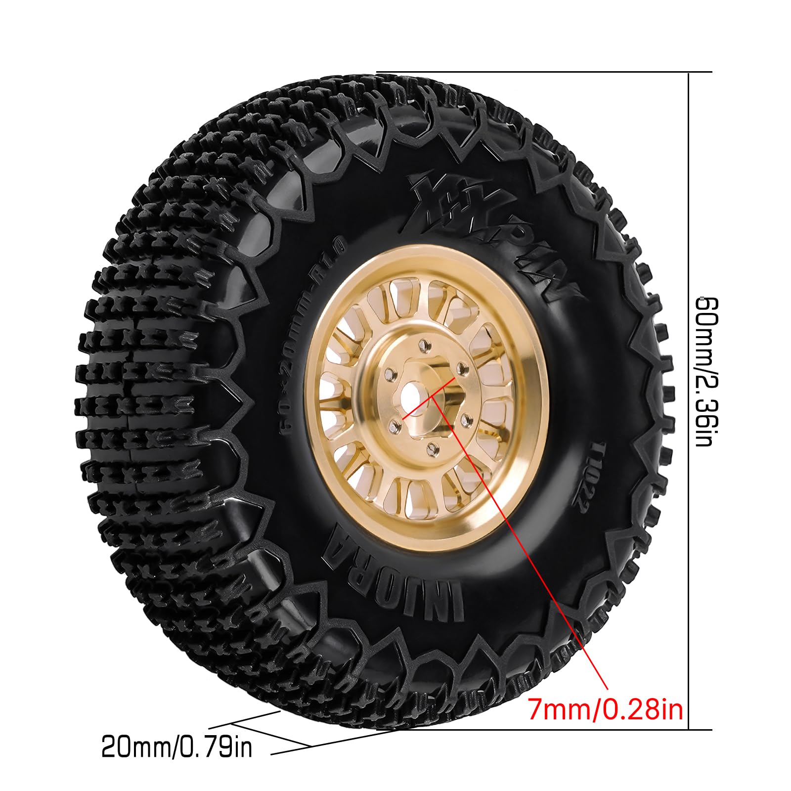 - Q: What are the specifications of the INJORA 1.0 XHX Pin Tires and Brass Beadlock Wheels? A: The INJORA 1.0 XHX Pin Tires feature a super soft and sticky S5 compound, with an outer diameter of 60mm (2.36in) and a width of 20mm (0.79in). Each tire weighs 11g (0.024lb). The accompanying brass beadlock wheels have an offset of -3.75mm (-0.15in), an outer diameter of 28mm (1.1in), a width of 13.5mm (0.53in), and a weight of 41g per piece (0.09lb).