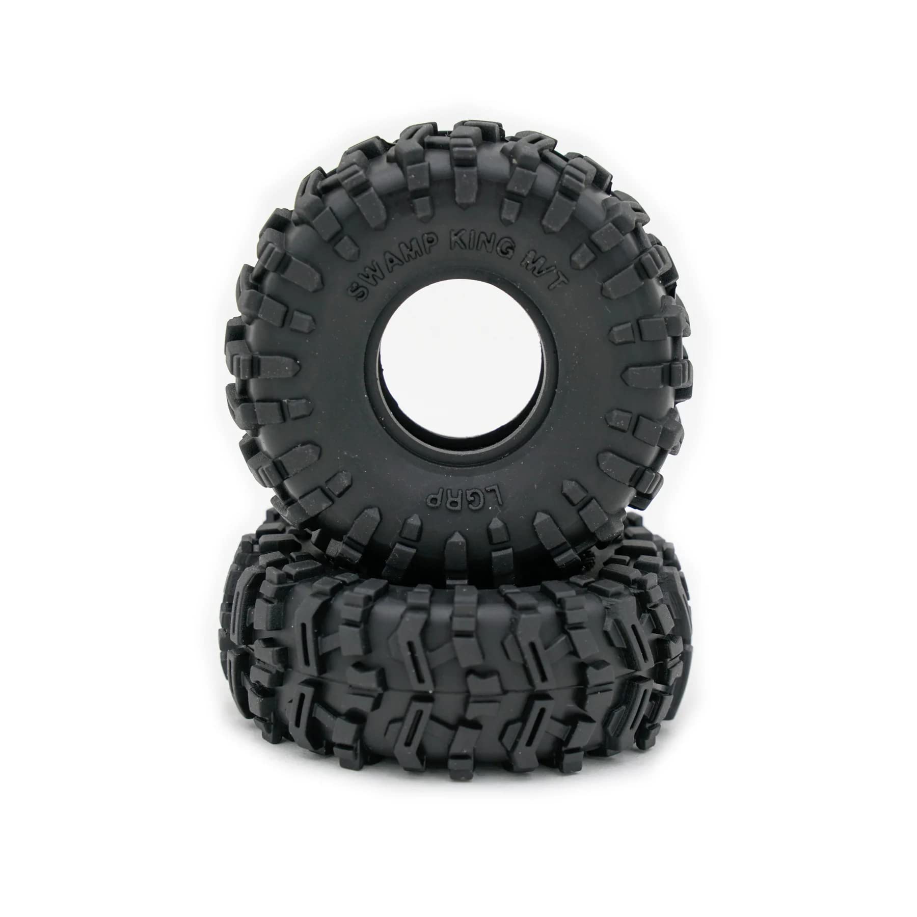 Seeking maximum performance out of your RC Crawler? The Swamp King M/T tire is going to be a huge step in the right direction! This oversized tire is ready to dominate almost any obstacle in its way. With this aggressive tread pattern combined with our NL2 competition compound rubber, your rig will be more capable than ever. This tire will fit all LGRP brand wheels and most other 1.0 wheels on the market. Dimensions of tire: Outer diameter (OD): 64mm / 2.48 Width: 24.5mm / .96 Whats included: (1) Set of 4 Swamp King M/T 1.0 Tires (1) Set of 4 foam inserts Due to not having control of other manufacturers' specs, we can not guarantee these will or will not fit on your specific wheels, all wheels we have tested fitment on have fit and de-beading has not been an issue. We recommend using vented wheels with our tires, if you do not have or have the ability to vent the wheels a few small holes on the center of the tread in a few points will let the tire breathe properly Also included is a free sticker pack 2'' x 4'' of Little Guy Racing Stickers