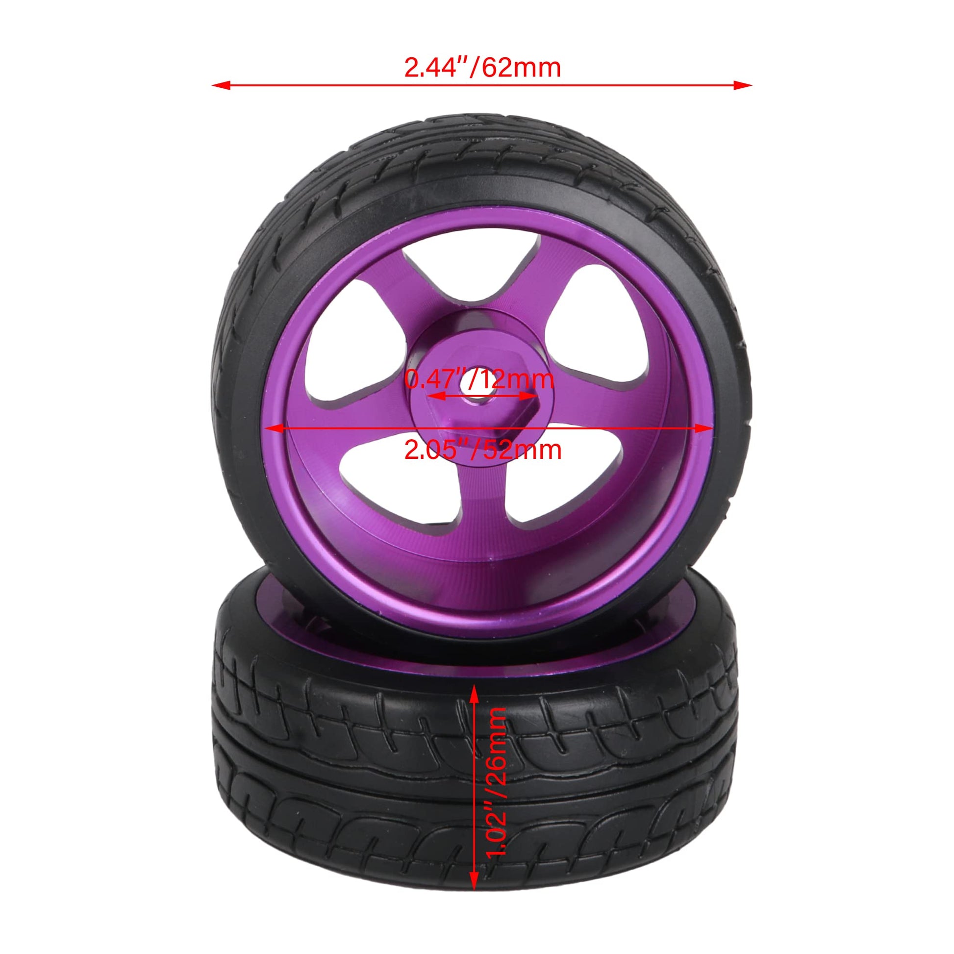 1. High quality materials: These tires are made of high-quality soft rubber, and the wheels are made of high-quality plastic. 2. Perfect grip: The tires have specially designed tread patterns that provide optimal grip and traction, thereby enhancing control and maneuverability during races. 3. Suitable for flat racing: Designed specifically for flat racing, this tire provides excellent stability and speed, making it an ideal choice for competitive racing events. 4. Easy to install: Easy to replace, small in size, easy to disassemble and install, and more convenient to use. 5. Enhanced performance: With its excellent structure and design, the tires provide improved acceleration, cornering, and overall performance, giving racers a track advantage. Note: The tire and wheel rim are separated. The tire must be mounted and glued to the wheel rims by yourself. Specifications: Material: Aluminum Alloy, Plastic Color: Purple & Black Size: RC Wheel Rim: 52 x 26mm/2.04 x 1.02inch(Dia x W) RC Tyre: 62 x 26mm/2.44 x 1.02inch(Dia x W) RC Hexagonal joints: 12mm/0.47inch Weight: 201g Package include: 4 x RC Wheel Rim 4 x RC Tires