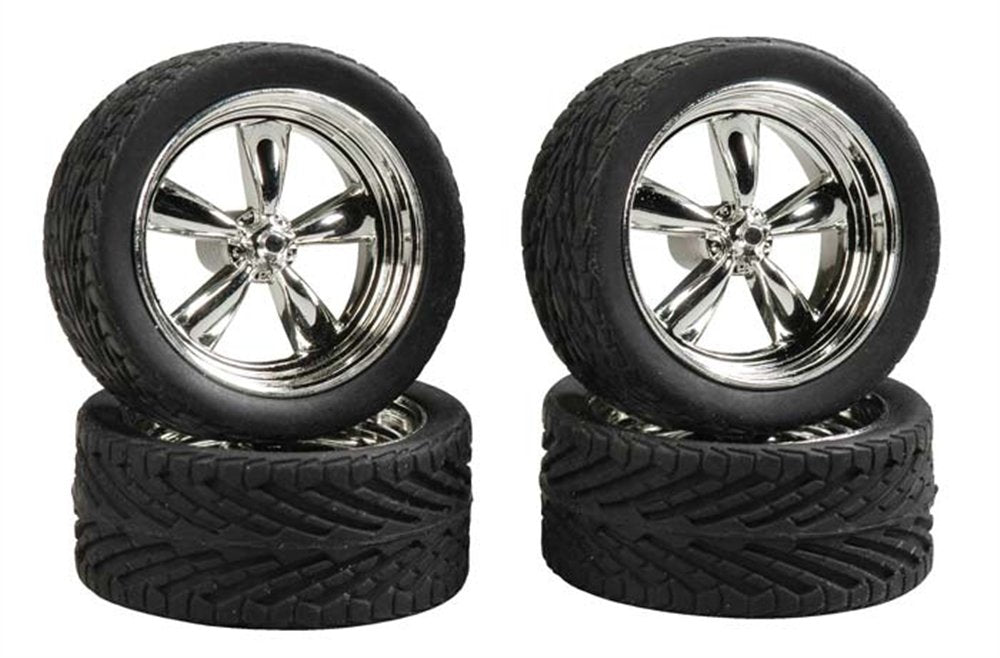 For use on most 1/24-1/25 scale plastic models. Includes 4 plastic chrome rims and 4 black vinyl tires.