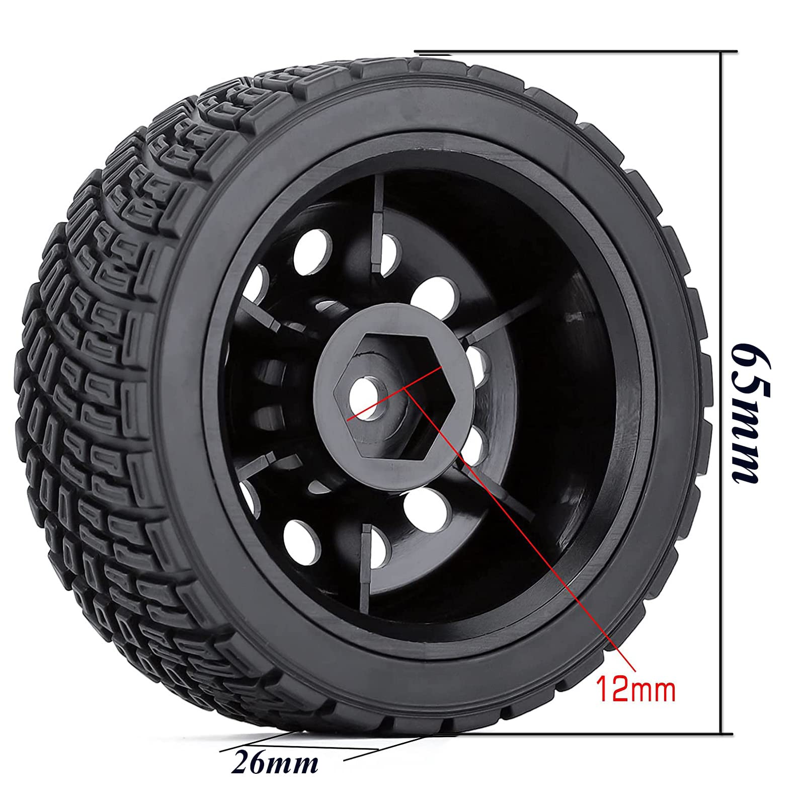 - Q: What is the size specification of the tires and rims? A: The tires have an outer diameter of 65mm and a width of 26mm, while the wheel rim diameter is 52mm with a rim width of 26mm. They also feature a hexagon adapter size of 12mm.