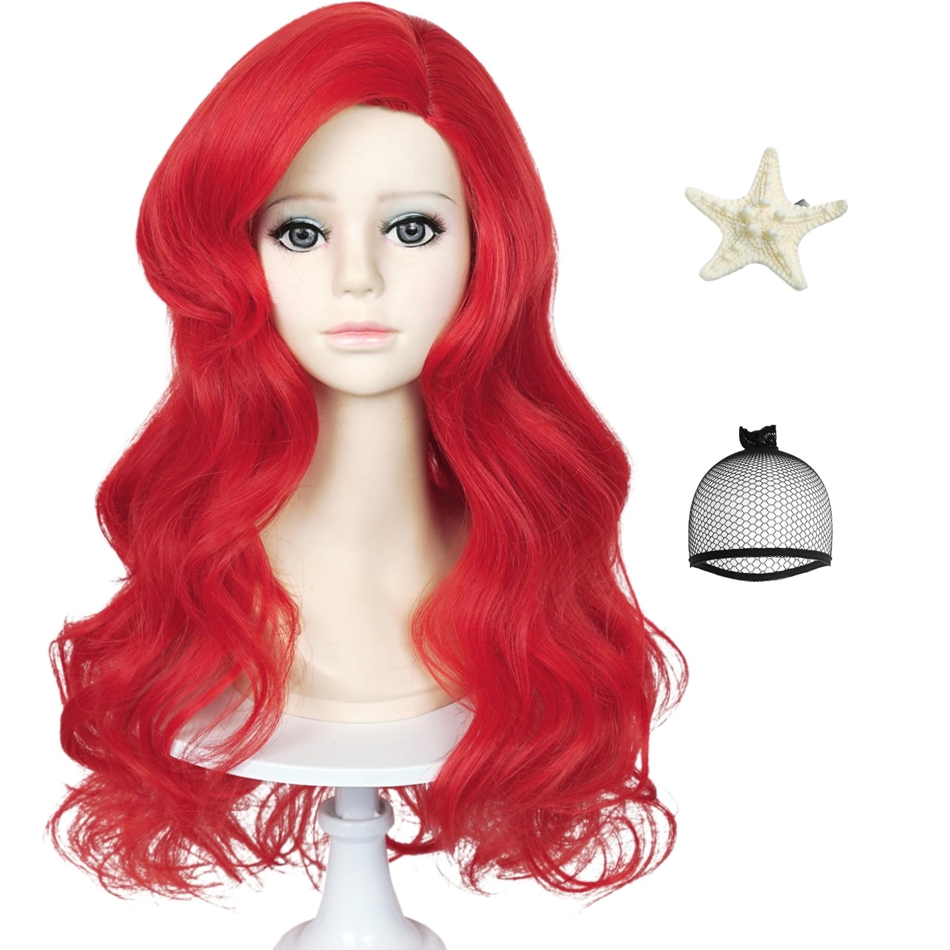 Mermaid Wigs For Kids Girls 21-Inch Long Red Curly Kid'S Mermaid Wig Wave Wigs With Starfish Hairclip & Hair Net For Halloween C