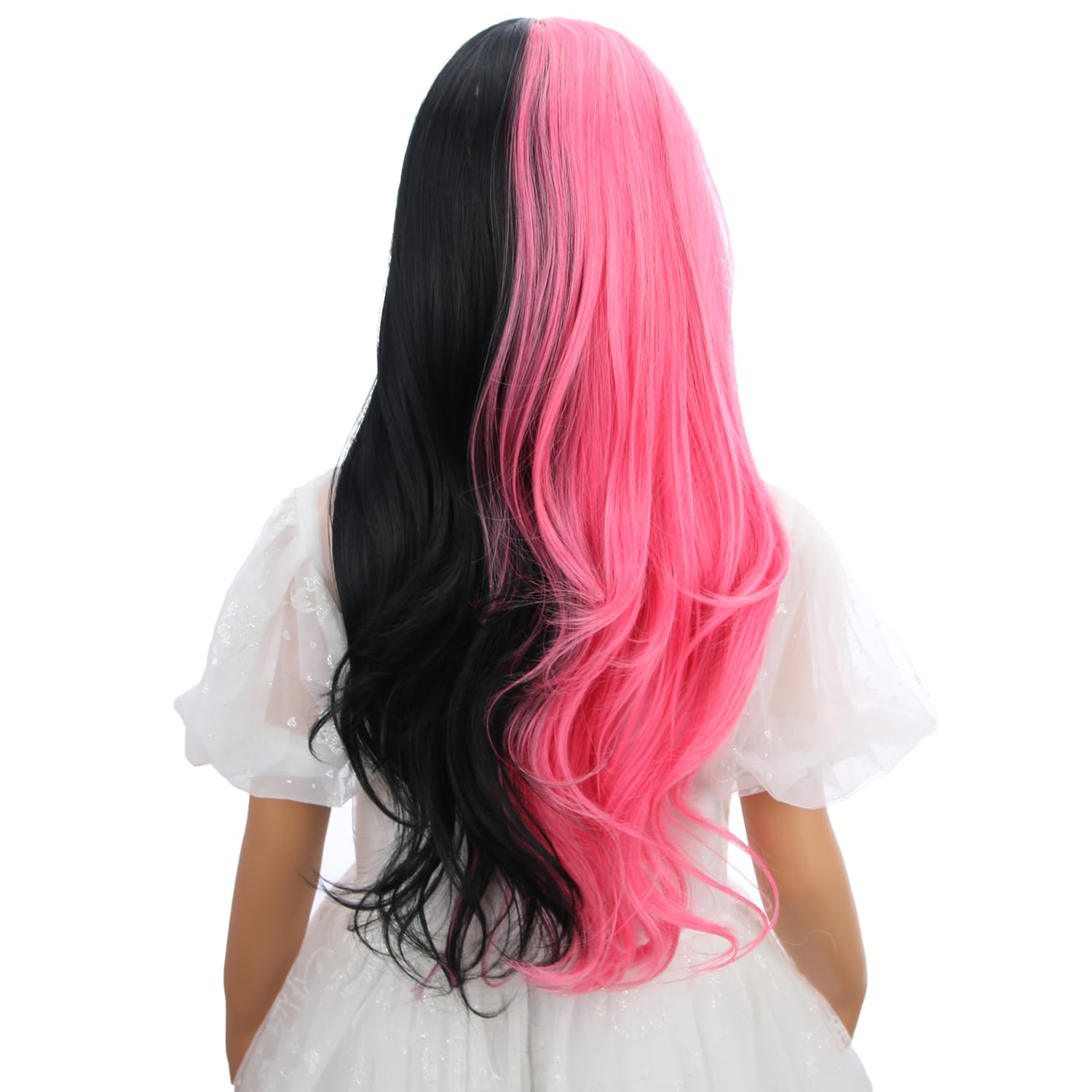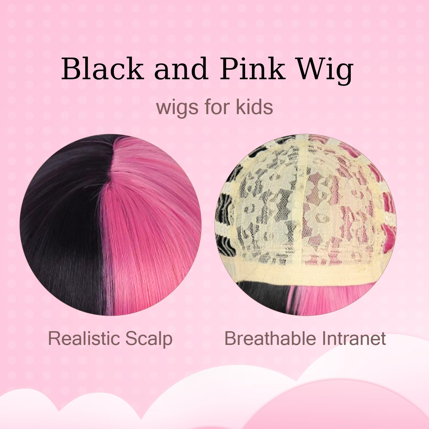 Wavelnm Kids Black Pink Wig With Bangs Child Half Pink And Half Black Wig Long Wavy Curly Wig For Girls Synthetic Wigs With Wig