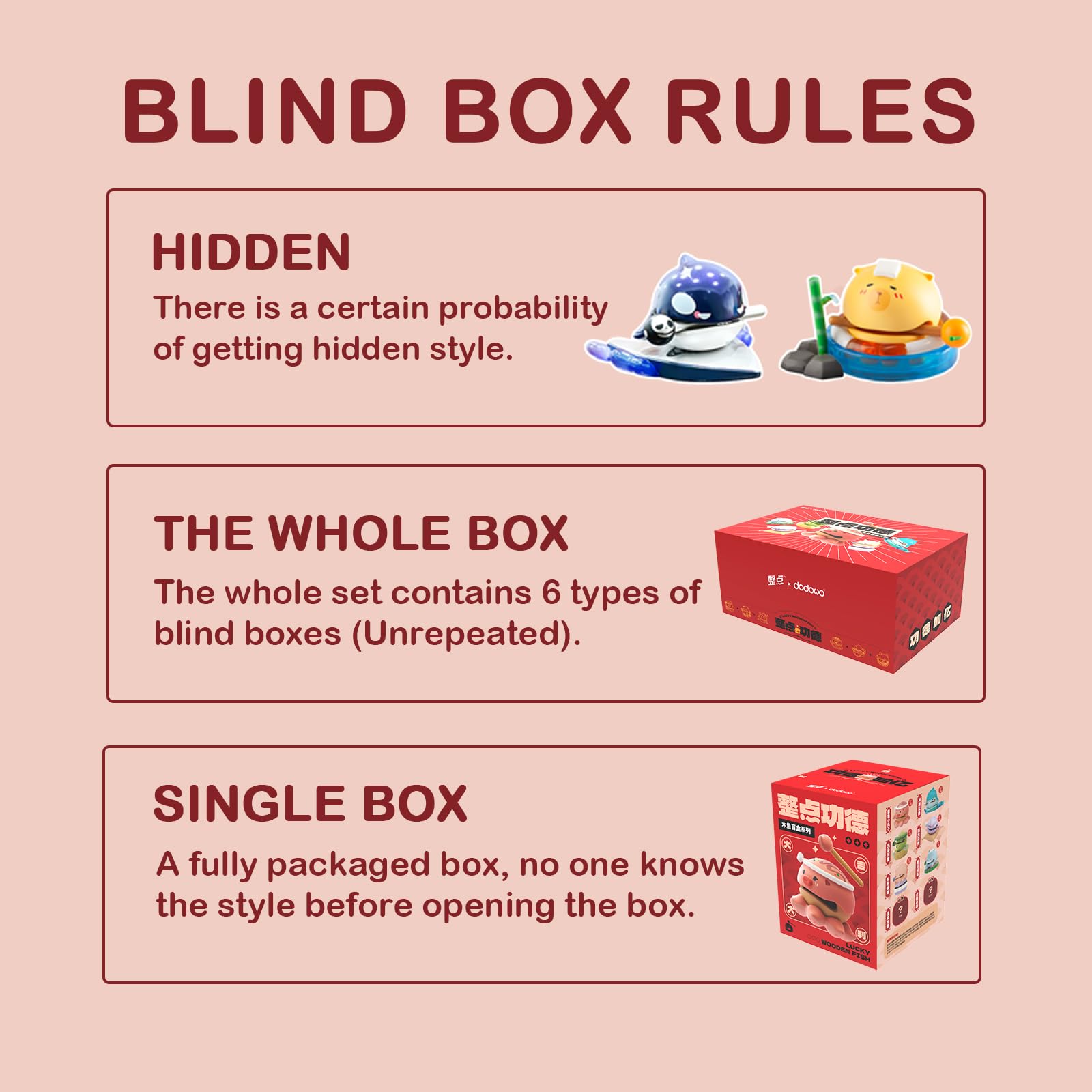 Lucky Wooden Fish Series. ?6 regular figures and 2 hidden editions to collect. ?Enjoy the exciting moment of unboxing! Hope you could get your favorite one.NOTE: ?The figures of the blind boxes are shipped randomly and can't be specified. ?Return is not supported once the packaging box is opened, for it can't be sold again after being opened.