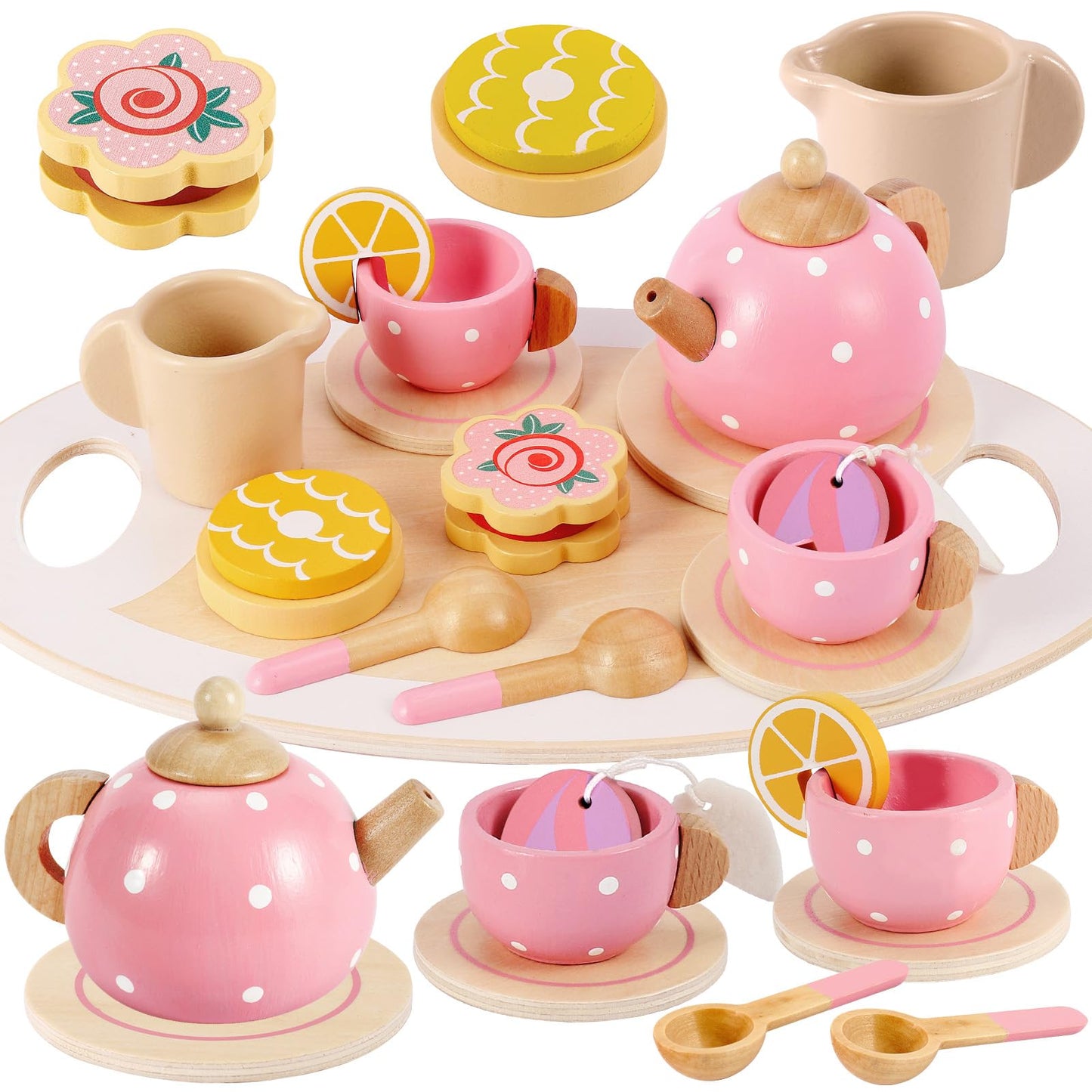 BUYGER Pretend Play Princess Tea Party Set for 3 4 5 6 + Year Old Wooden Kitchen Play Food Accessories Sets Gifts for Toddler Li