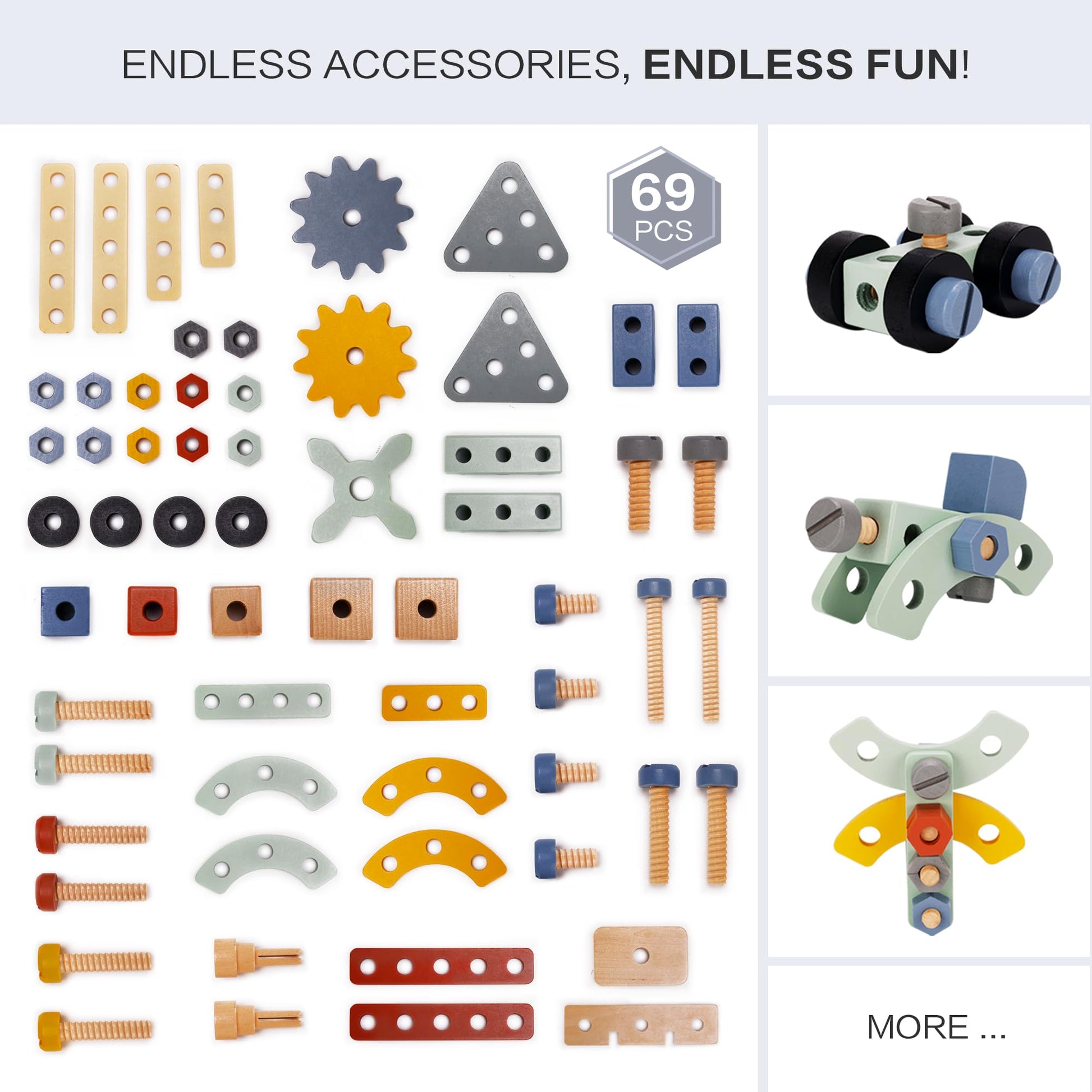 Deluxe Accessories & Fun - The workbench includes 69 pieces of tools and play accessories, offering endless building possibilities. Kids can use their imagination and creativity, engaging in immersive play sessions with friends. The large storage space underneath the bench allows for easy organization and quick clean-up | Montessori-inspired Design - This wooden toy workbench incorporates Montessori principles, promoting hands-on learning and independent exploration. With its carefully selected tools and components, it encourages children to engage in open-ended play and develop essential skills at their own pace | Durable & Safe Construction - Crafted from high-quality wood, this kids-sized workbench ensures long-lasting durability. The sturdy construction guarantees the toy's ability to withstand active play. All tools and components have smooth surfaces and rounded edges, prioritizing the safety of young children during playtime | Skill Development - Designed for little hands, the workbench helps develop hand-eye coordination, fine motor skills, and problem-solving abilities. Kids can practice various tasks and learn how to use tools, fostering their technological and building skills | Perfect Gift - The Deluxe Wooden Toy Workbench is an ideal present for birthdays, Christmas, and other special occasions. Suitable for children ages 3 and up, it provides endless hours of fun and learning opportunities