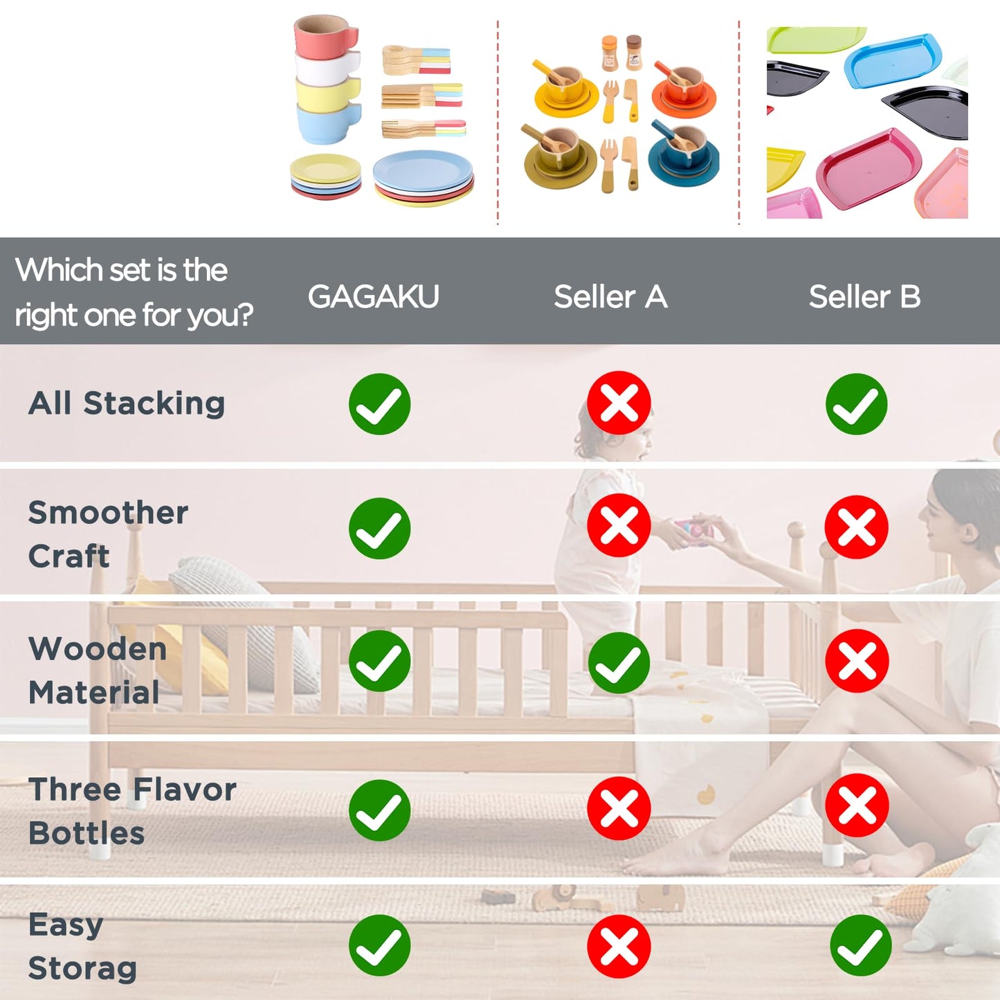 - Q: How many pieces are included in the GAGAKU Wooden Play Dishes set? A: The GAGAKU Wooden Play Dishes set includes a total of 27 pieces, which consist of plates, saucers, cups, spoons, knives, forks, condiment bottles, and a sugar jar.