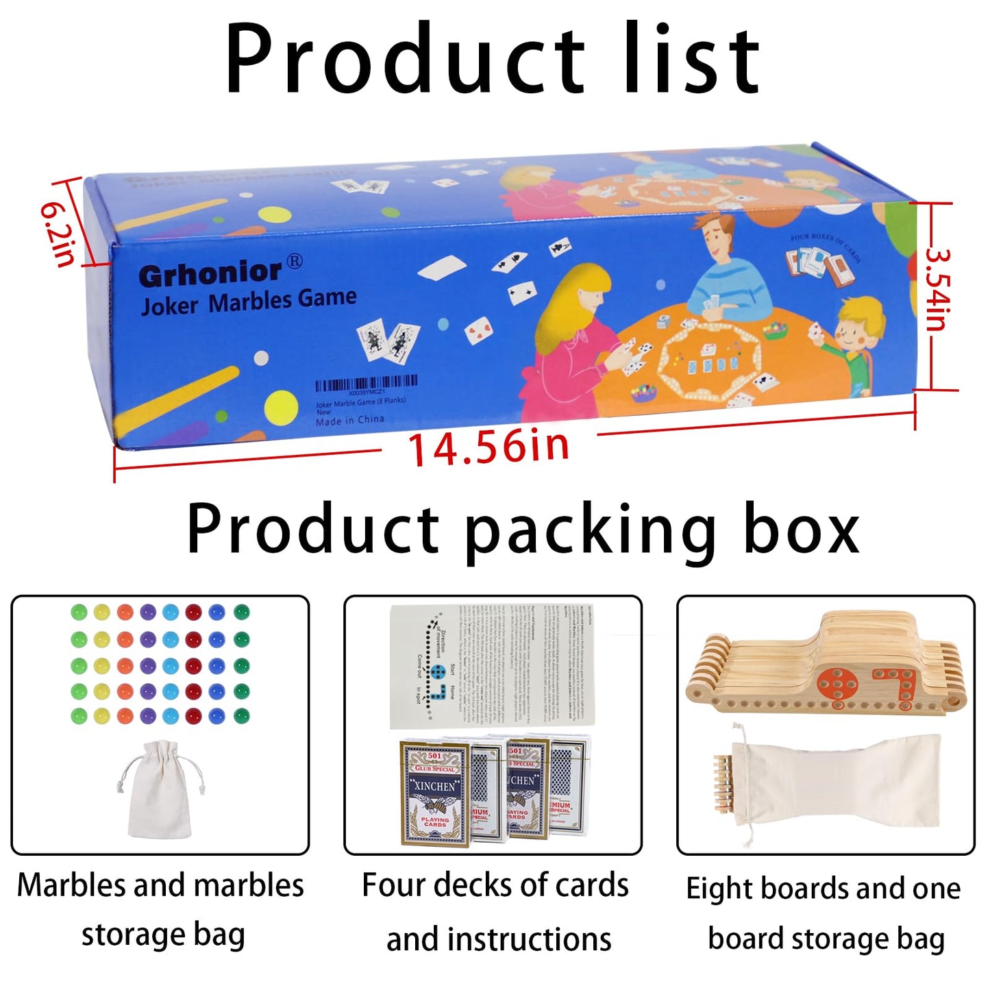 The Jokers and marbles board game is made of high quality wooden (away from plastic products).It includes 8 boards+4 decks of playing cards +40 pcs paintballs (regular size)+2 storage bags+2 game instructions.Each board measures approximately 14.17x4.7x0.6 inches.