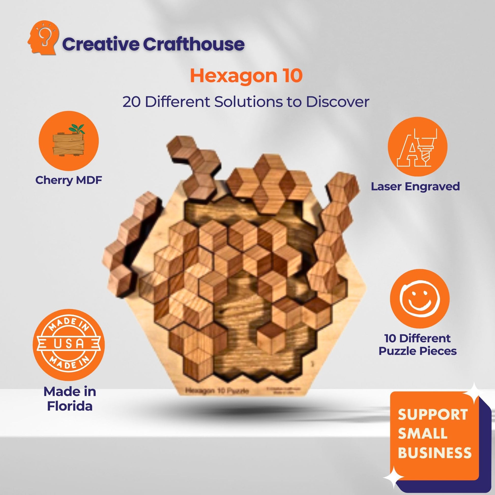 Discover the Hexagon 10 by Creative Crafthouse, a captivating wooden brain teaser puzzle, proudly Made in our Hudson, Florida USA family workshop. Enjoy screen-free fun with this engaging logic game offering 20 unique solutions. Handcrafted from premium Alder or Cherry wood, this tactile puzzle sharpens spatial reasoning and provides hours of mindful relaxation for teens and adults. A unique, American-made gift supporting a small family business. ''Unplug the cord & Plug in your mind'' with this heirloom-quality STEM toy. Ideal for puzzle enthusiasts and families seeking quality time.
