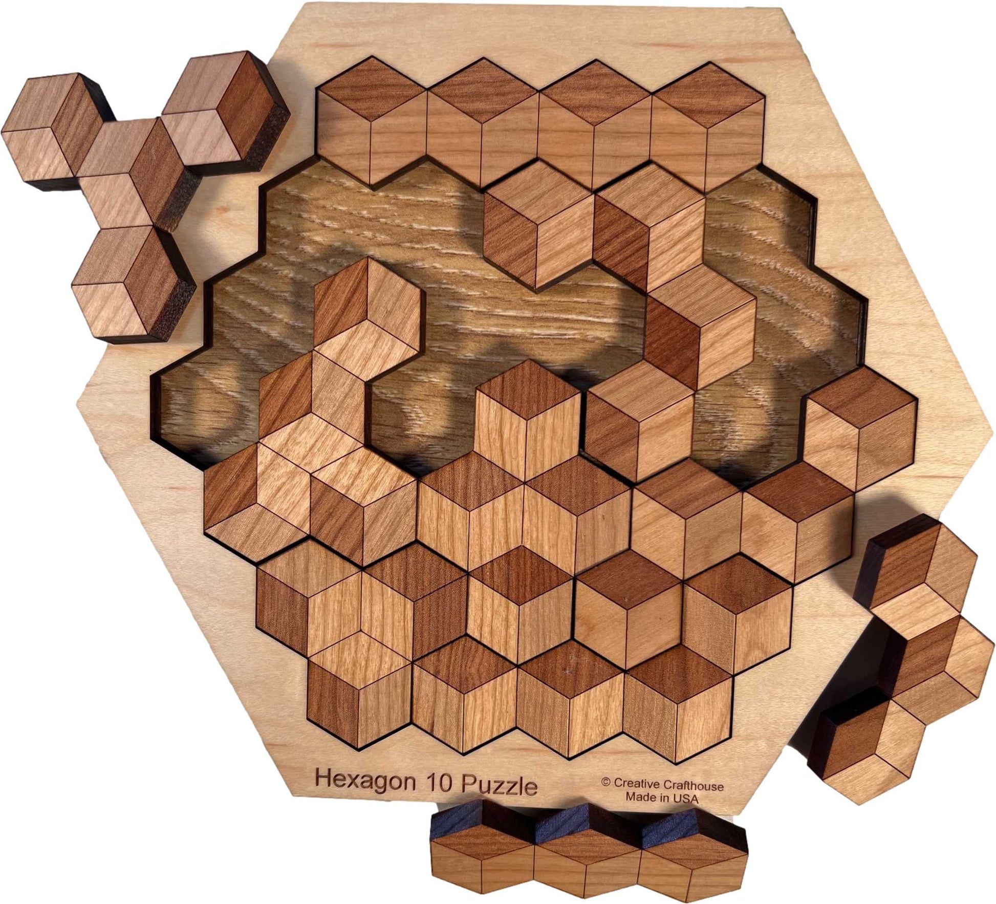 Hexagon 10 Wood Puzzle Brain Teaser, 20 Solutions, USA Made Logic Game