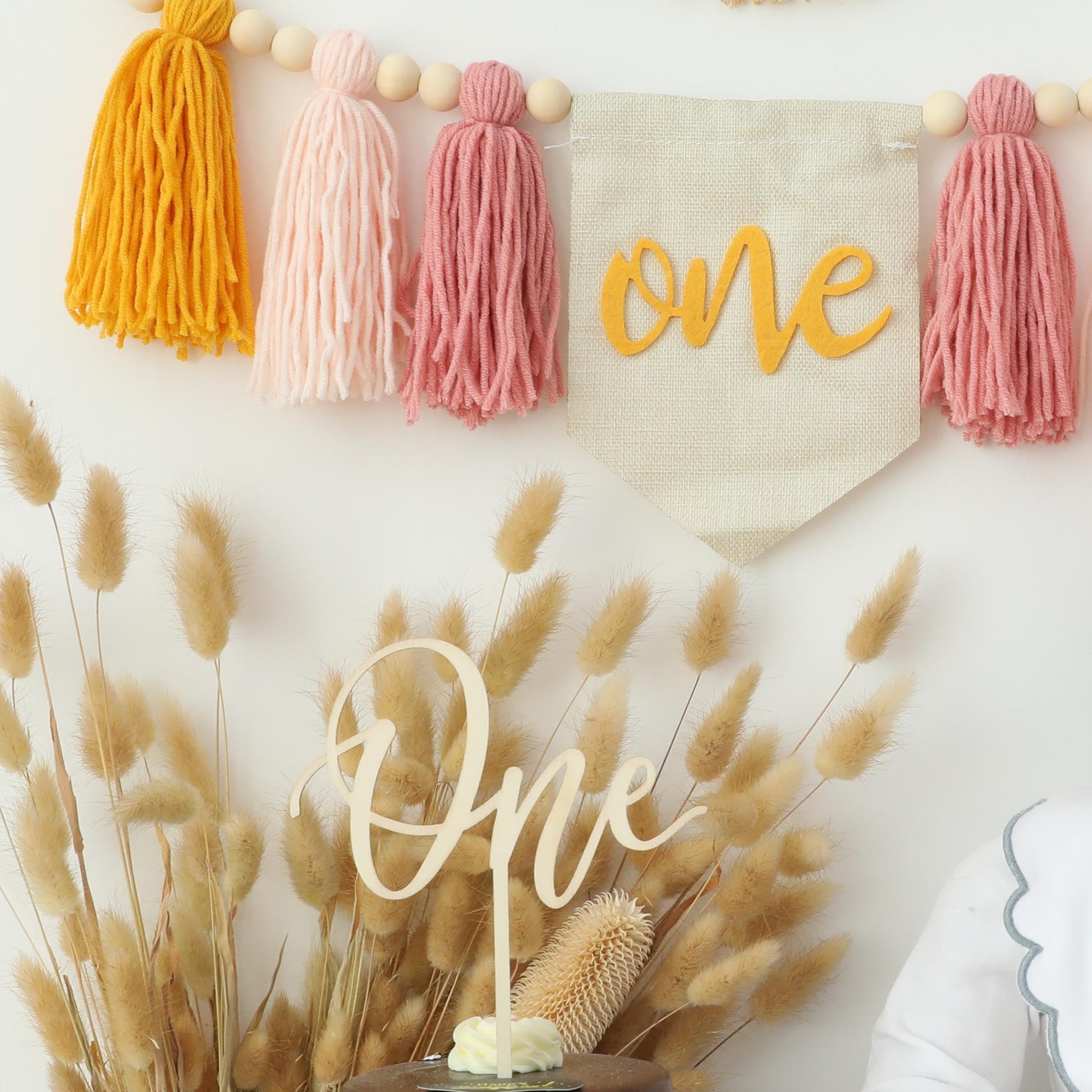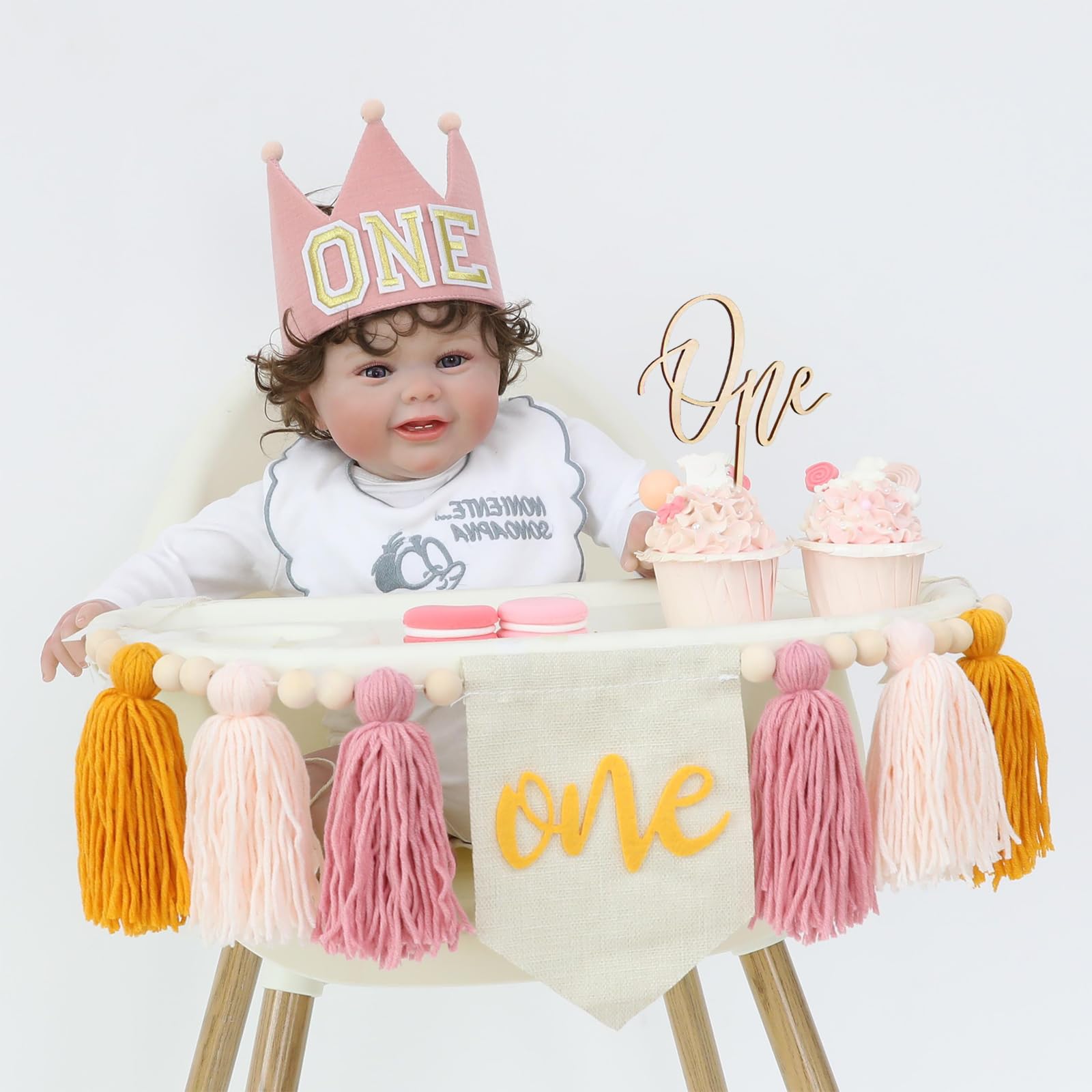 HODIHIWI Baby Girls Pink Yellow 1st High Chair Banner Wood Bead Tassel Garland Crown Hat Wooden Cake Topper Birthday Party Decor