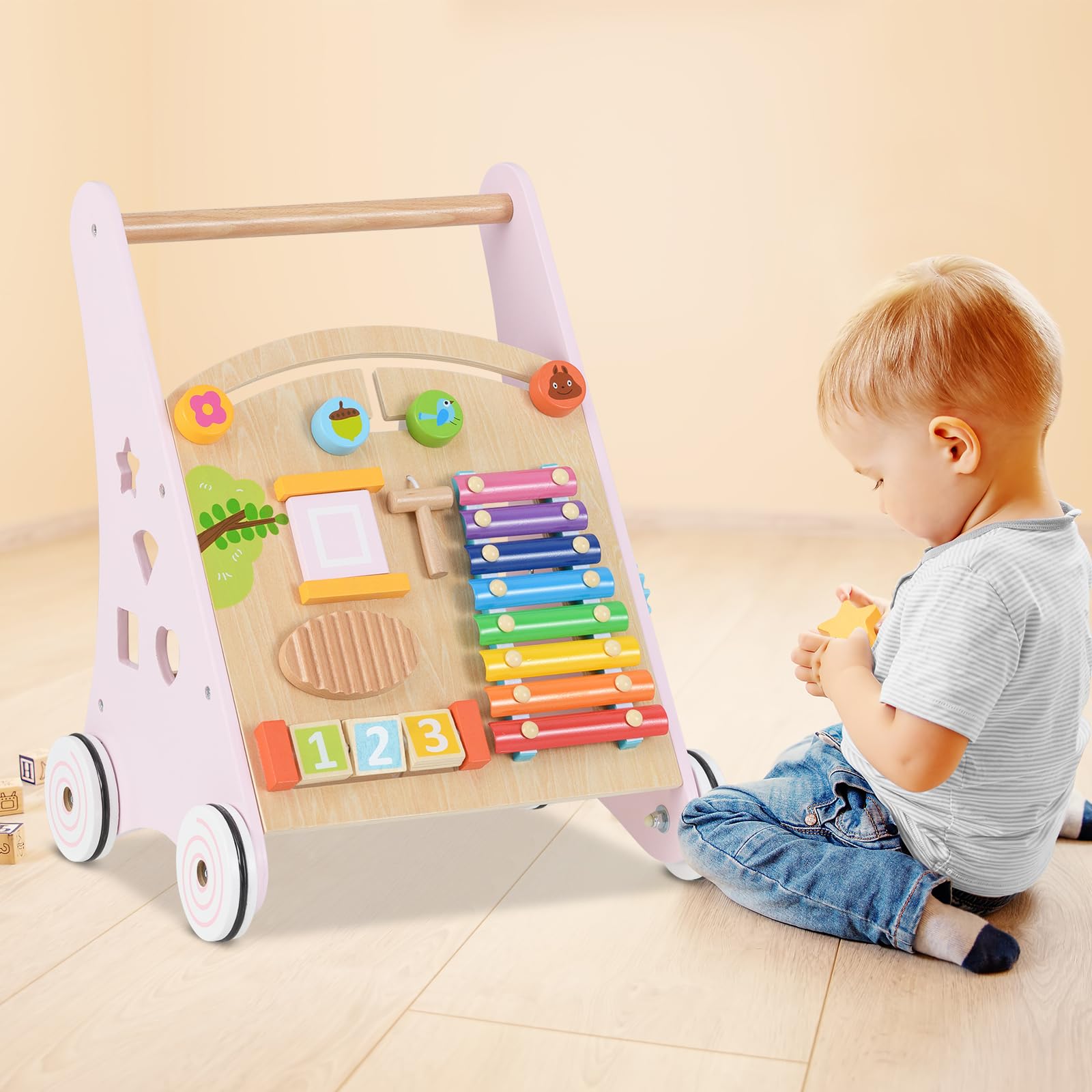 Why do you choose INFANS Baby Push Walker? This baby push toy is made of sturdy and durable materials, safe and non-toxic. Equipped with a tracking maze, flip board, hand touch board, rotating blocks, wooden hammer, xylophone, spinning gears, shape recognition, and a toy storage box, allowing babies to develop hand-eye coordination skills and stimulate creativity and imagination. The back storage compartment makes it convenient for babies to store toys and fosters organizational skills. The anti-skid wheels on the bottom allow babies to easily push the cart. This educational baby activity walker is fully functional and suitable for babies to play and learn during their growth, making it an essential and fun toy for babies' development! Features: Comes with 9 fun activities keep baby entertained The rubber wheel is non-slip and anti-rollover to ensure the stability Enhances baby physical coordination and stimulates sensory development The carefully designed height encourage proper leg alignment Wonderful Gift for Christmas, New Year and Birthday Storage space on the back for toys and other items Motivate children to walk and help them walk independently Equipped with a handle that is easy to grip Specification: Color: Blue/Pink Material: Wood Net Weight: 4.5 lbs Overall Dimension: 13.5 x 12 x 17.5 (L x W x H) Package includes: 1 x Baby Push Walker 1 x Instruction