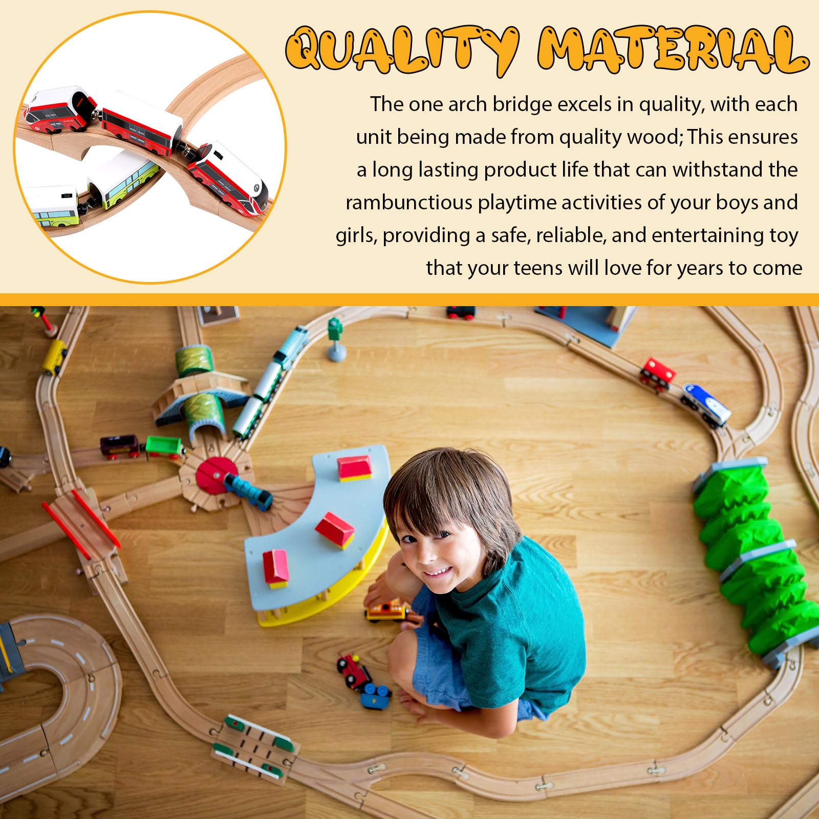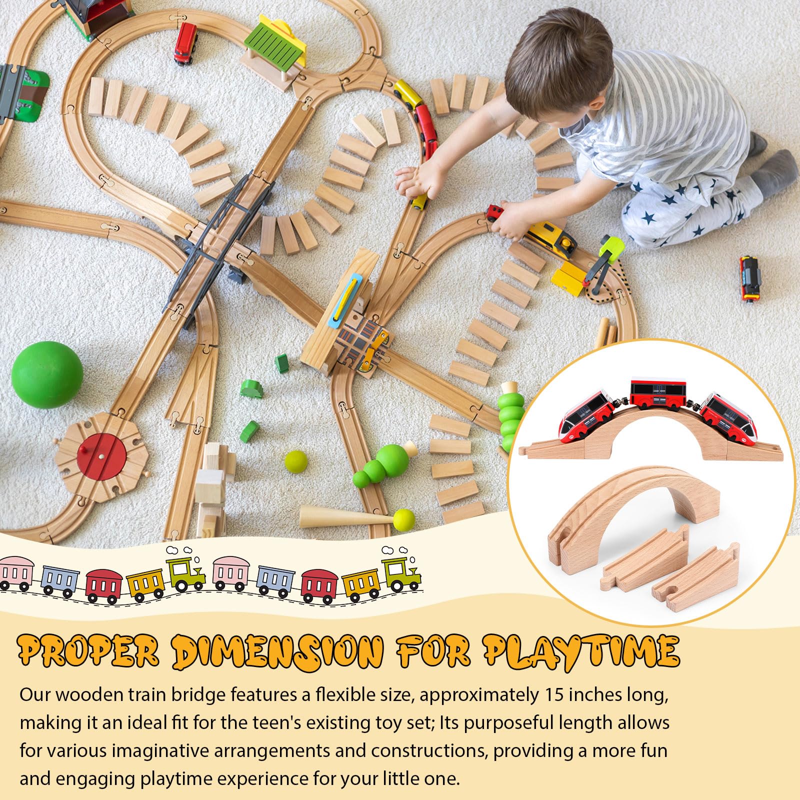 Features: Whether it's a birthday, Christmas or just for fun, the wood train track bridge can be a nice and funny gift for your friend, families, classmates, etc. These wooden train accessories fit most major toy train railway expansion sets, which help inspire boys and girls' imagination and creativity. Specifications: Material: wood Color: as shown in pictures Size: approx. 15 x 1.6 x 2.8 inches/ 38 x 4 x 7 cm Package includes: 1 x Wood train track bridge Notes: Manual measurement, please allow slight errors on size. The color may exist a slight difference due to different screen displays. Suitable for people over 12 years old.