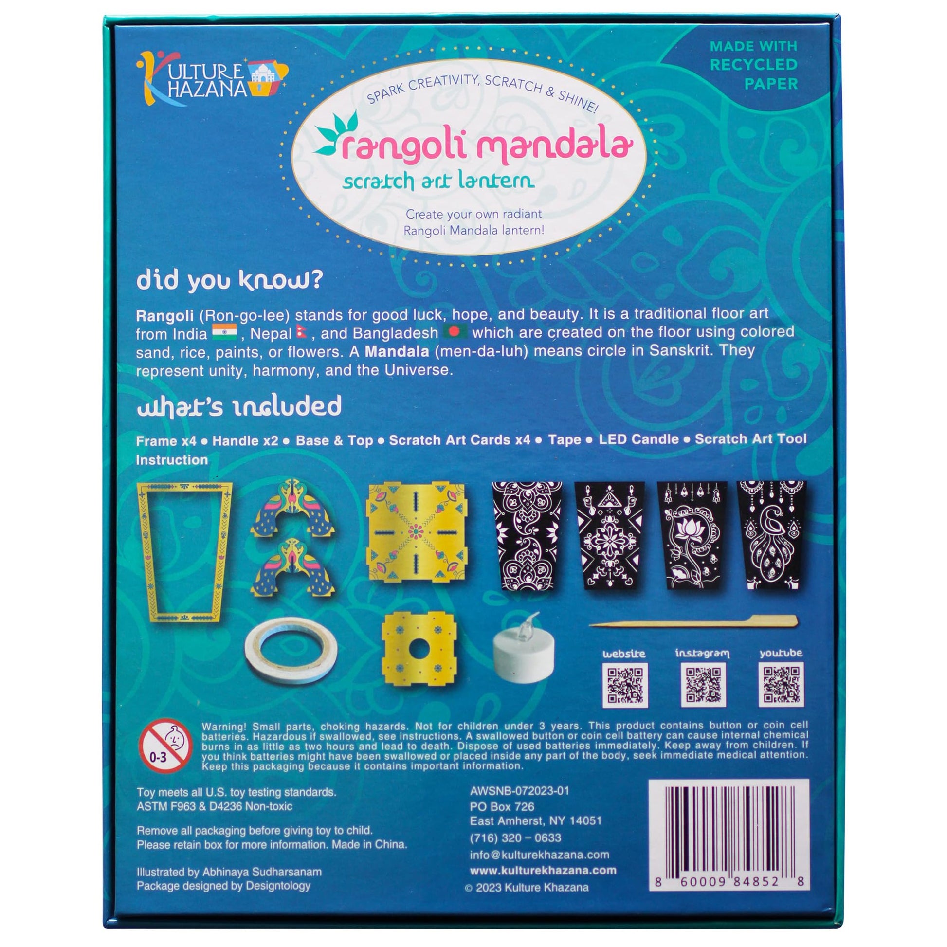 RANGOLI MANDALA: SCRATCH ART LANTERN KIT by Kulture Khazana illuminates creativity and celebrates Culture! Discover the Artistry of Rangoli with Our Magical Scratch Art Lantern Kit! Perfect for ages 6 and up, this enchanting kit brings the world of Rangoli art to life in a captivating and creative way. Perfect for Diwali, Holi, other holidays, and gifting. DIY KIT - Dive into the world of Rangoli with four intricate scratch cards. Simply scratch away the black surface to reveal vibrant colors beneath. Assemble the golden lantern frame and handle to create a stunning display for your Rangoli art. When put together, the lantern stands tall at over 12 inches, making it a mesmerizing centerpiece. Craft with precision using the included scratch tool. Double-sided tape ensures that your Rangoli designs stay securely in place. Illuminate your Rangoli lantern with the included LED candle, casting a warm and inviting glow on your masterpiece. Our step-by-step instruction sheet makes crafting a breeze, ensuring a delightful and satisfying experience for both beginners and experienced crafters. KIT INCLUDES: 4 Rangoli Mandala design scratch cards, a Golden lantern frame and handle, a scratch tool, double-sided tape, LED candle, and instructions sheet. Made with recycled paper.