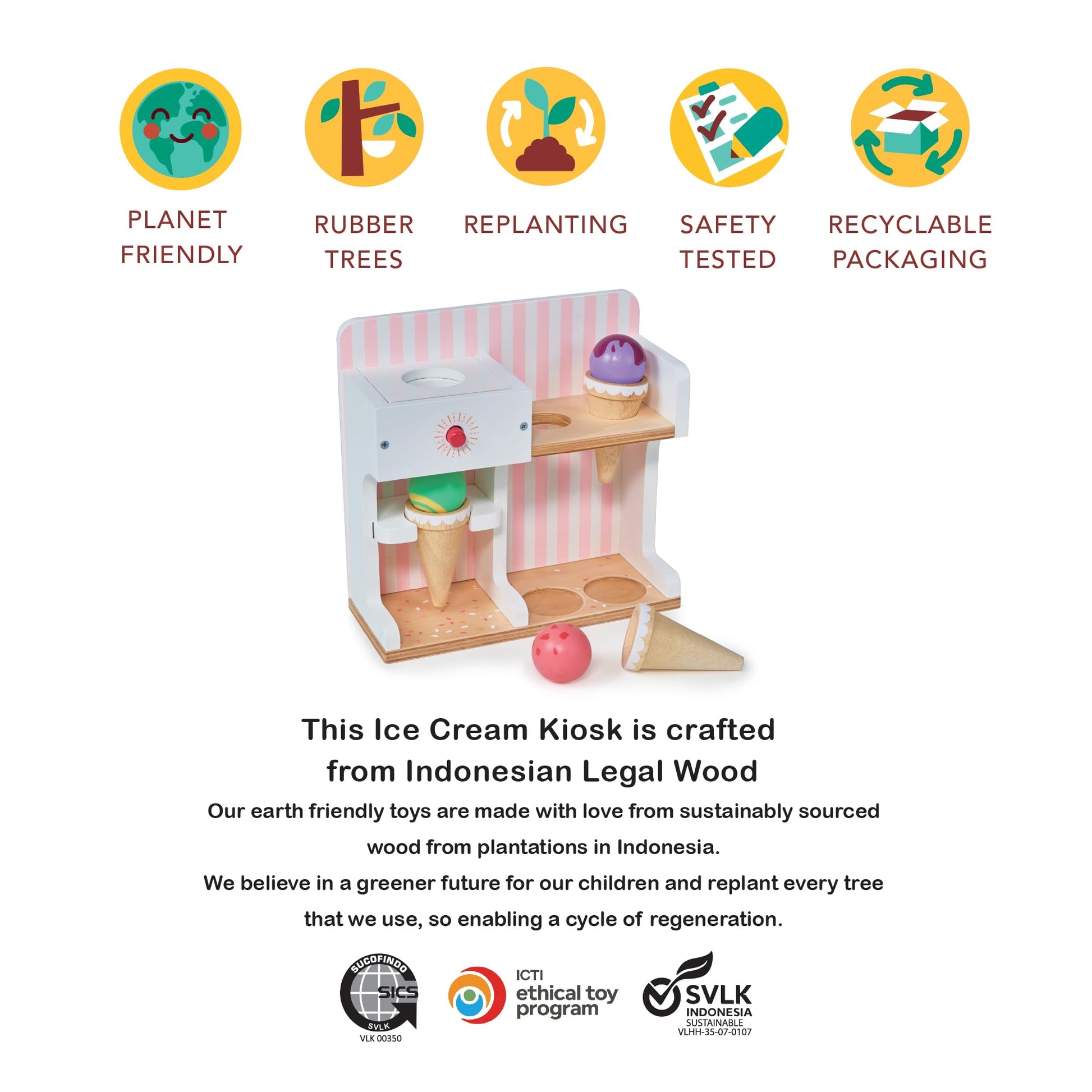 CHILL OUT & PLAY - THE COOLEST PRETEND ICE CREAM SHOP Step right up to the Ice Cream Kiosk, where little shopkeepers can scoop, stack, and serve up endless fun! This adorable wooden mini-shop comes with three tasty-looking toy cornets and three colorful ice cream scoops - mix, match, and create the sweetest combinations. But wait, theres a twist! Press the magical red button and watch as the scoop plops perfectly onto the cornet - just like real ice cream (minus the sticky fingers!). This delightful pretend play set is more than just a treat - it's a recipe for developing fine motor skills, hand-eye coordination, and social skills as kids take turns being the shopkeeper or the customer. Plus, little ones will sprinkle their playtime with creativity, problem-solving, and a scoop of confidence! Order up - whos ready for a double scoop of fun?