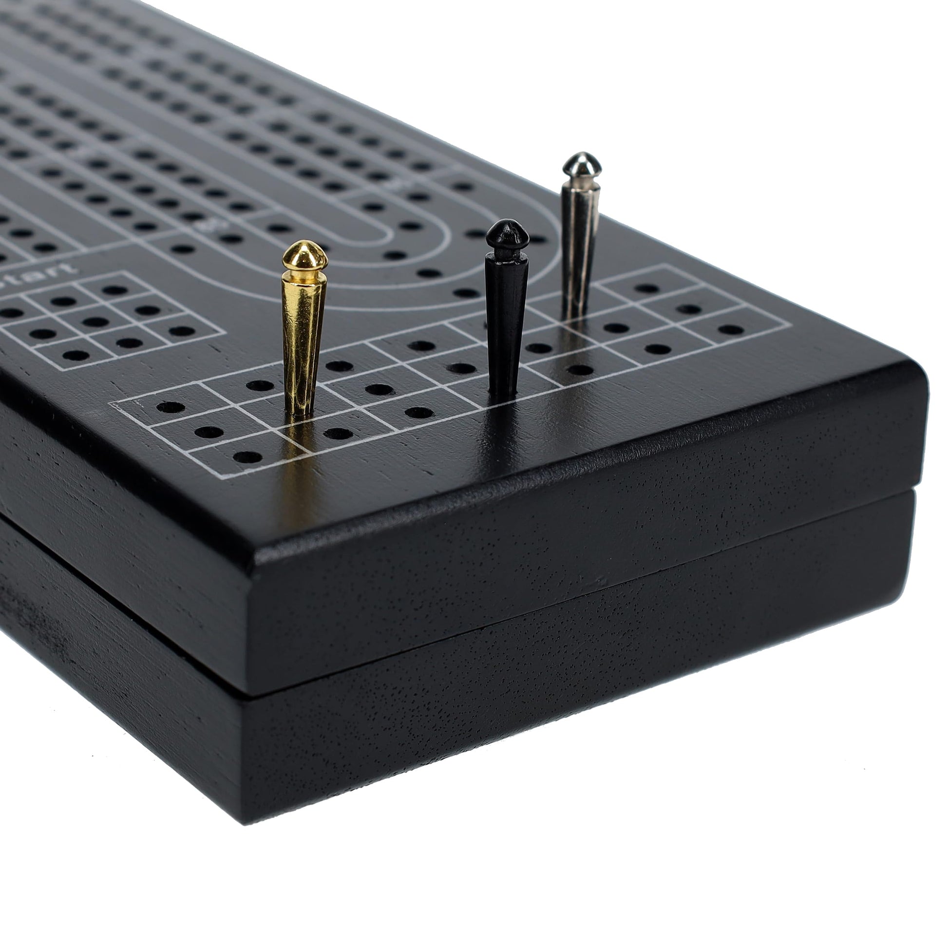 Pacific Shore Games Wooden Cribbage Board Game Set, Black Stained Continuous 3 Track For 2-3 Players With Card Storage