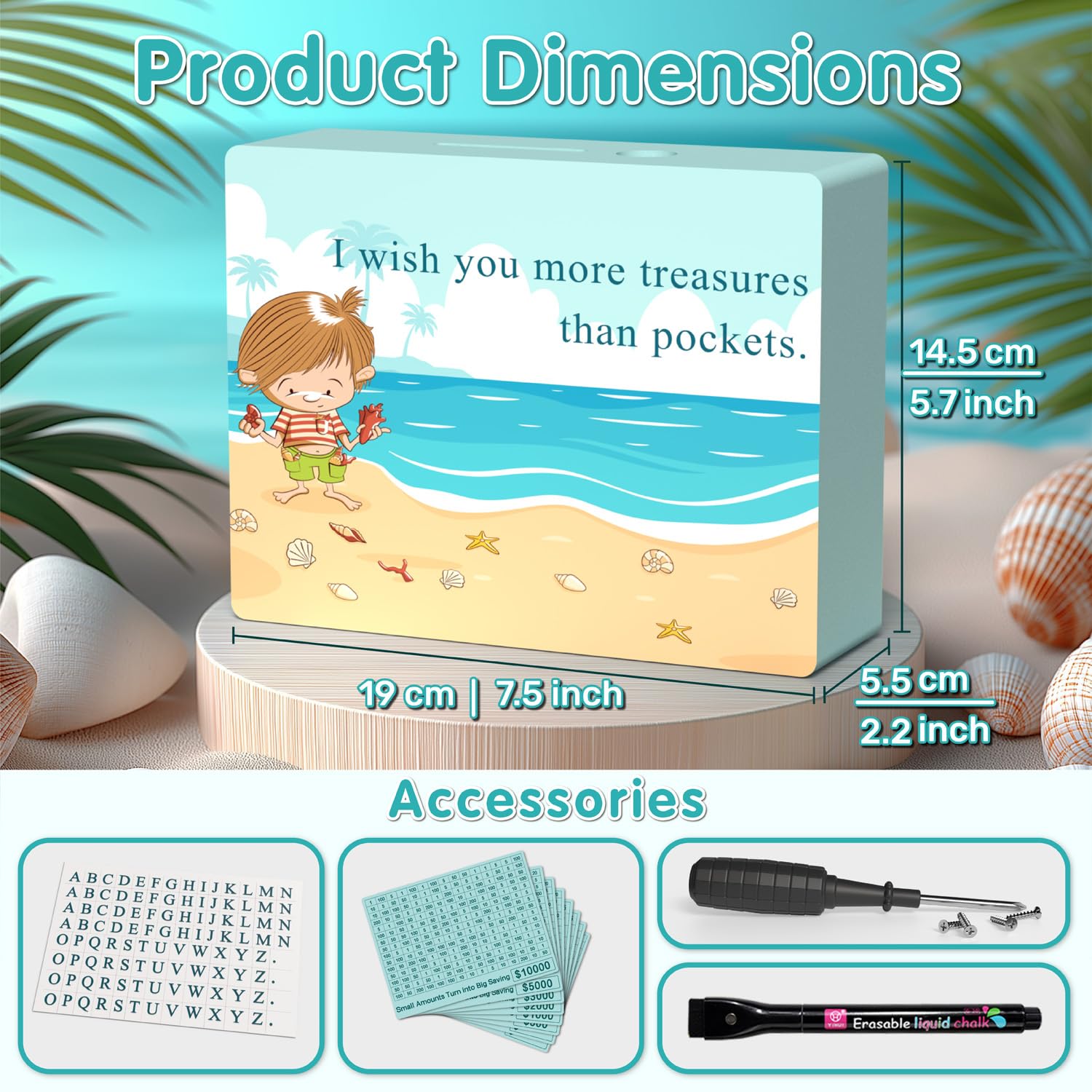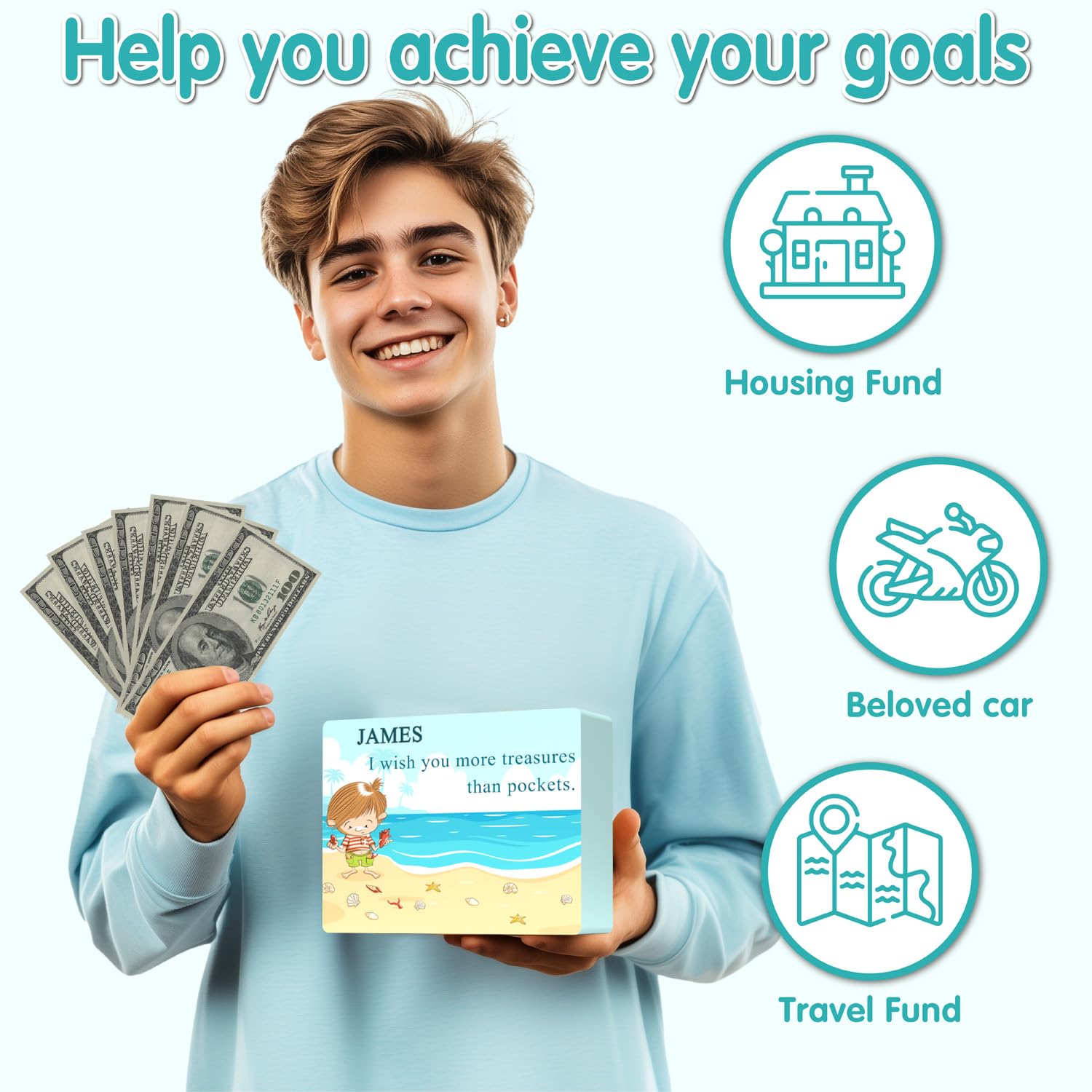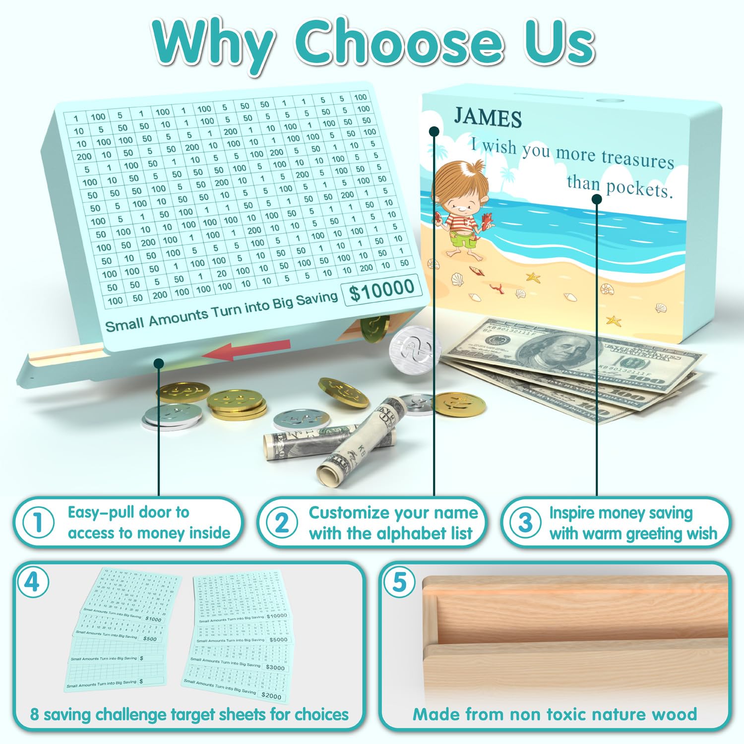 Personalized Cash Vault Wooden Savings Box 10000 with 8 Targets($500-5000), Reusable Money Saving Box for Cash 10000 with Easy-Pull Door, Caja De Ahorros 10000 with Greeting Wish, Ideal gifts for Men Boy