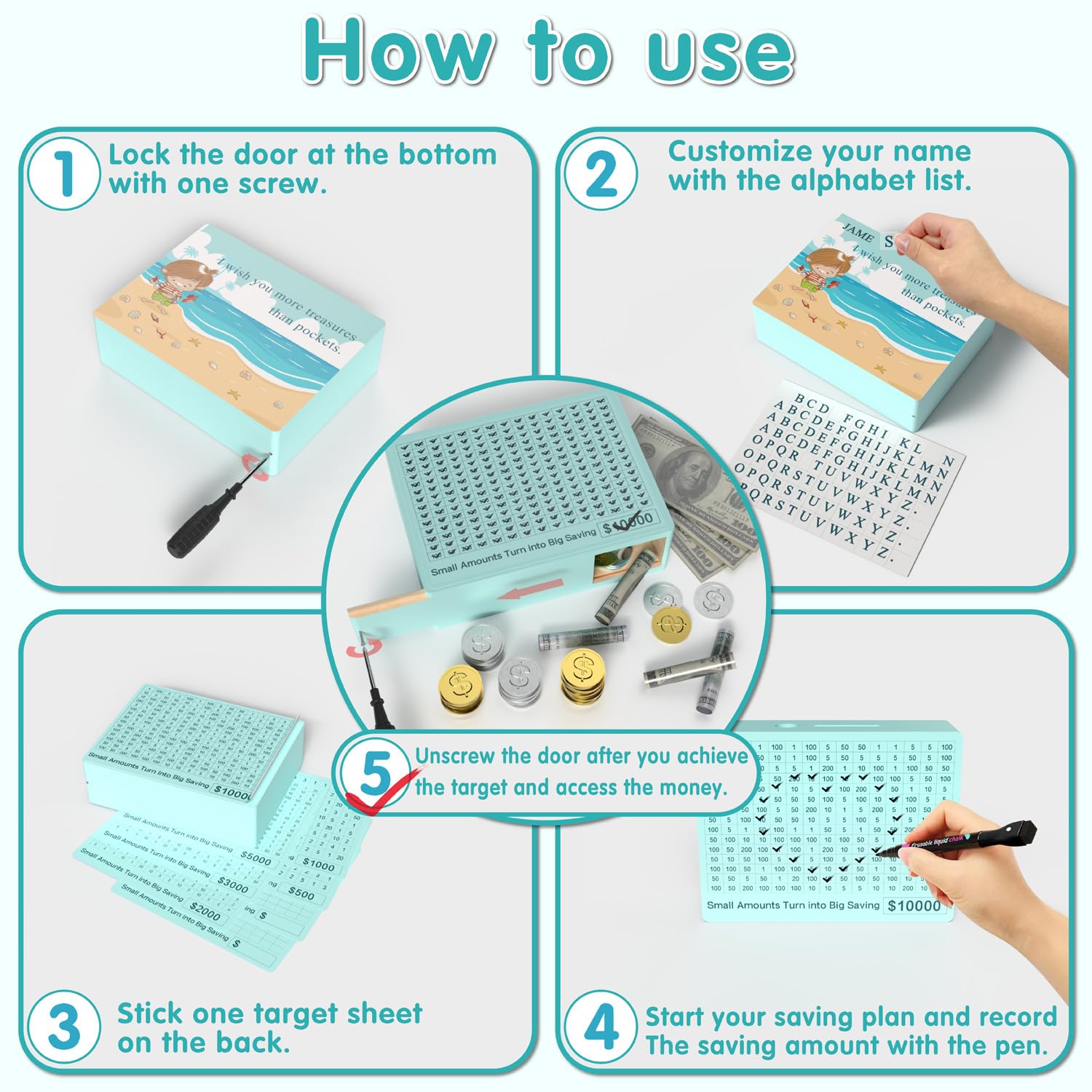 Personalized Cash Vault Wooden Savings Box 10000 With 8 Targets($500-5000),Reusable Money Saving Box For Cash 10000 With Easy-Pu