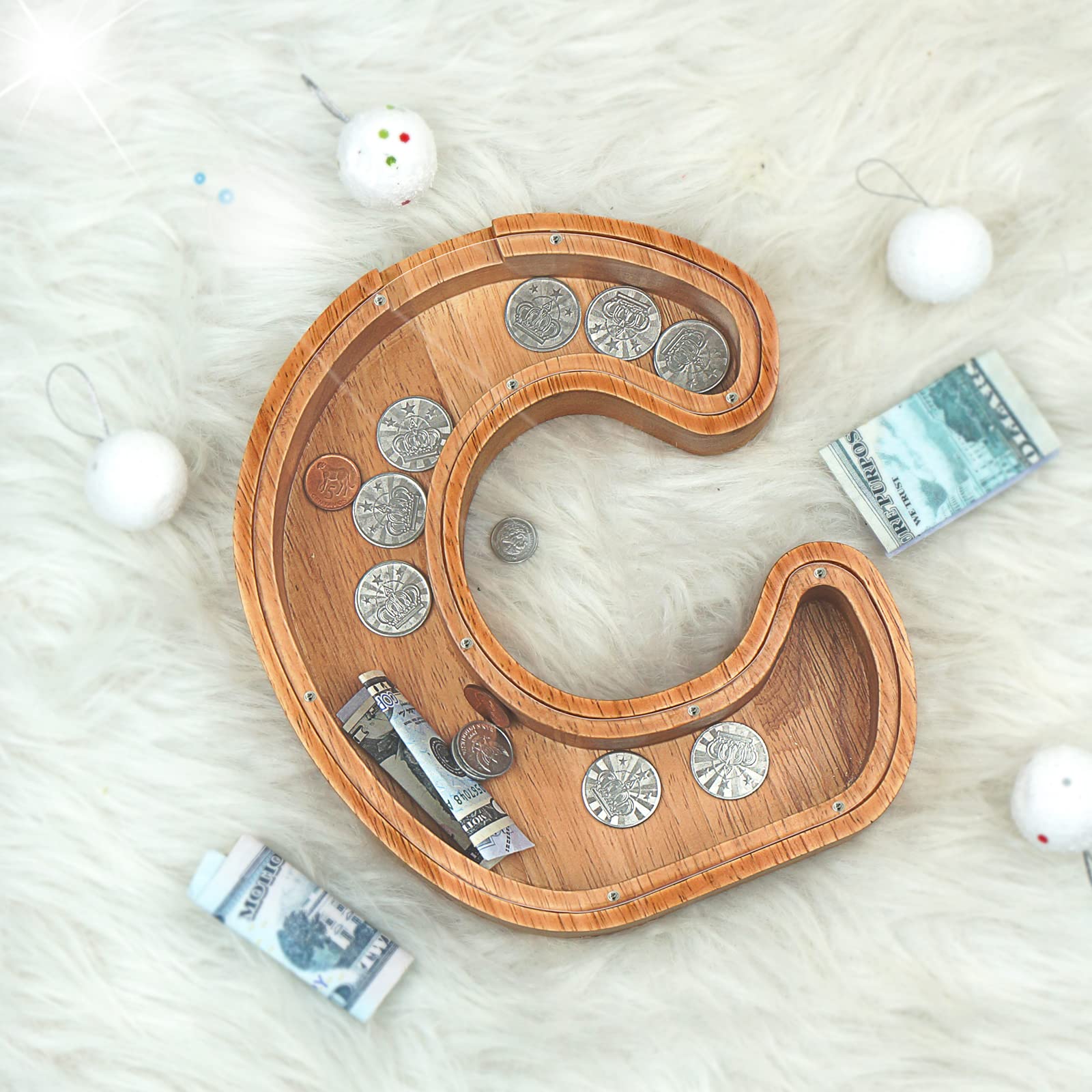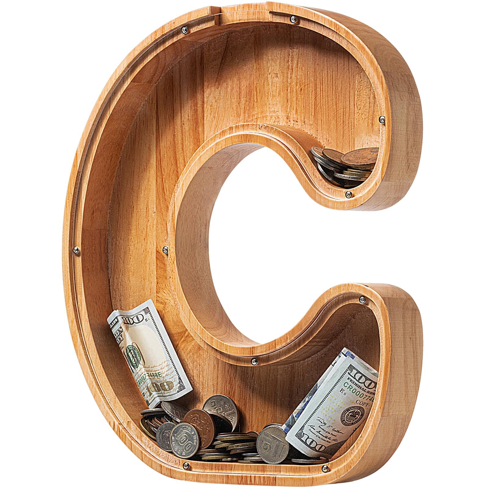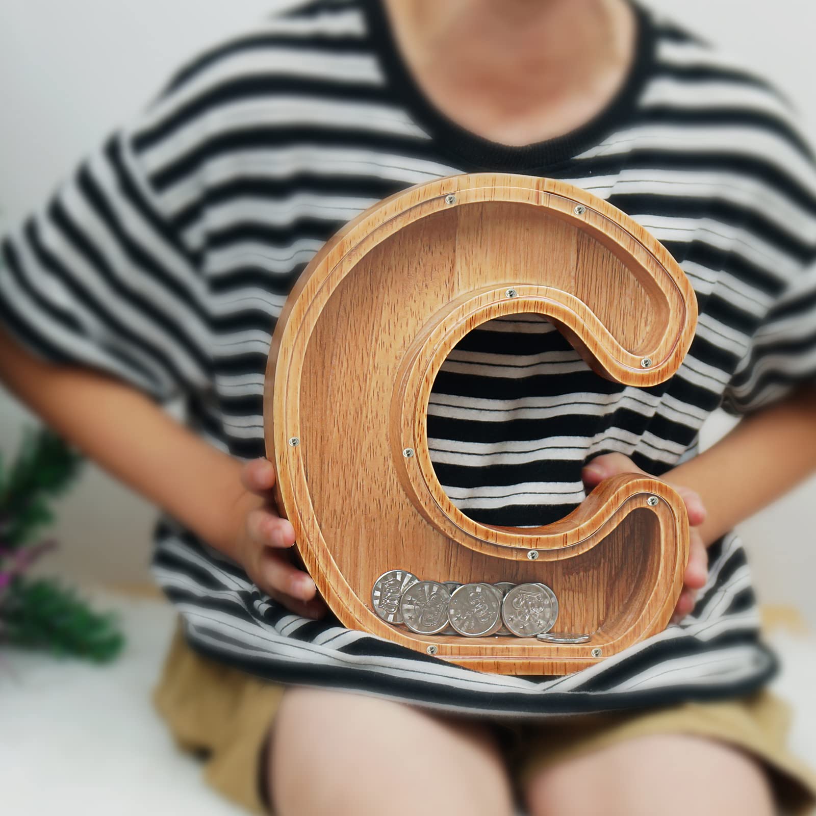 Piggy Bank For Kids Boys Girls, Large Personalized Wooden Letter Piggy Bank With Cut-Out Design, Alphabet Letter Coin Banks, Money Savings Box, Wooden Bank For Kids Creative Gift For Real-Money(C)