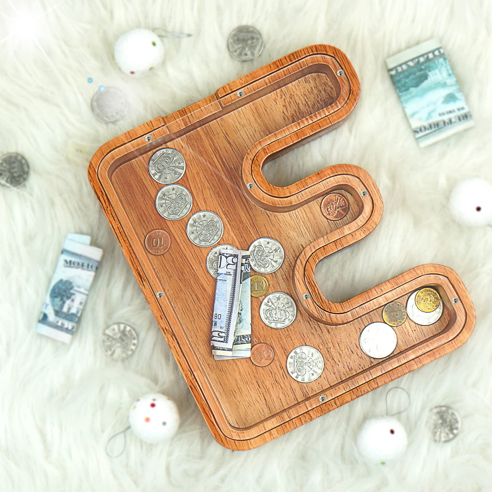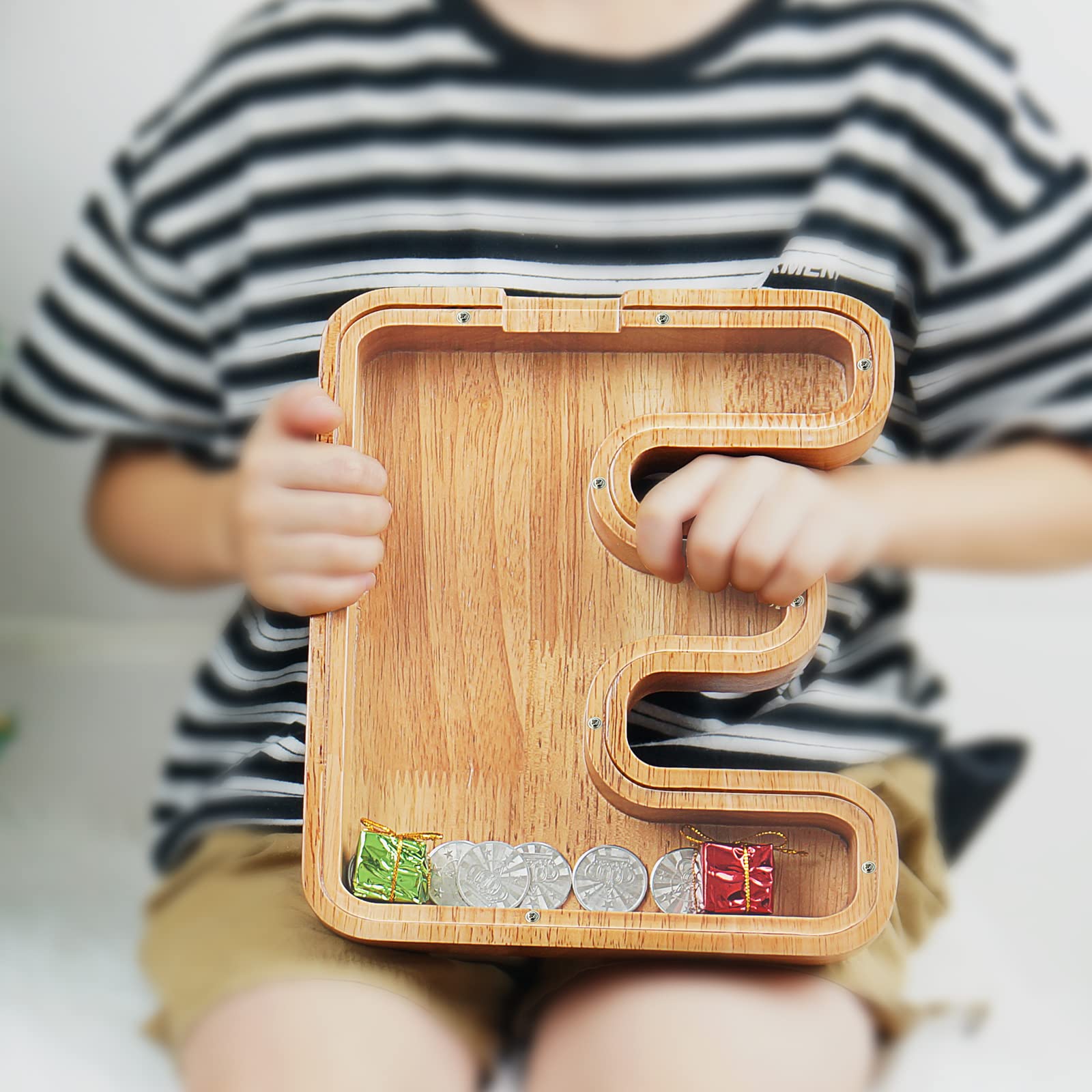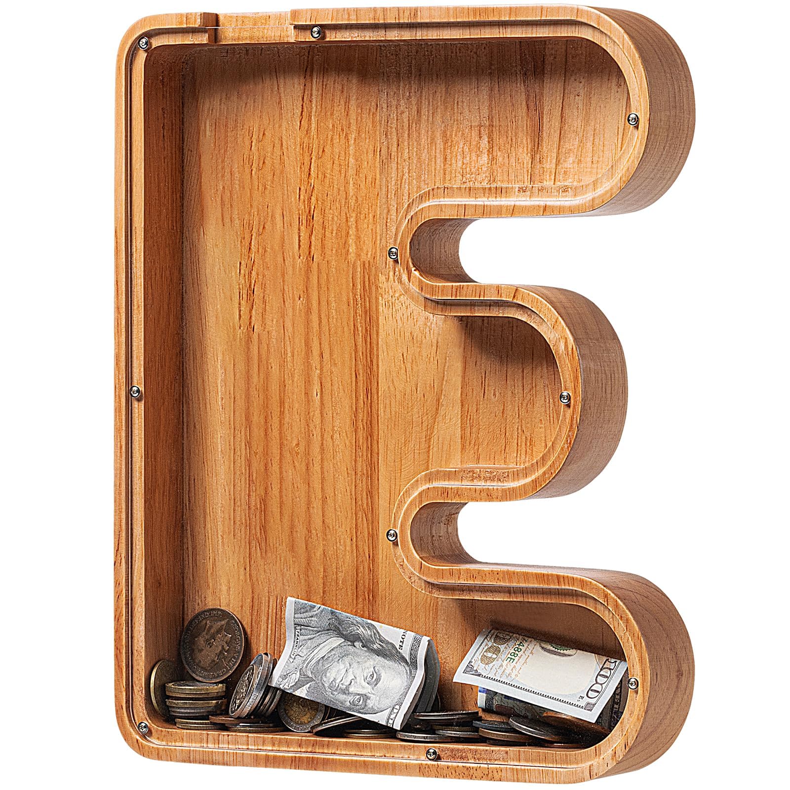 Piggy Bank For Kids Boys Girls, Large Personalized Wooden Letter Piggy Bank With Cut-Out Design, Alphabet Letter Coin Banks, Money Savings Box, Wooden Bank For Kids Creative Gift For Real-Money(E)