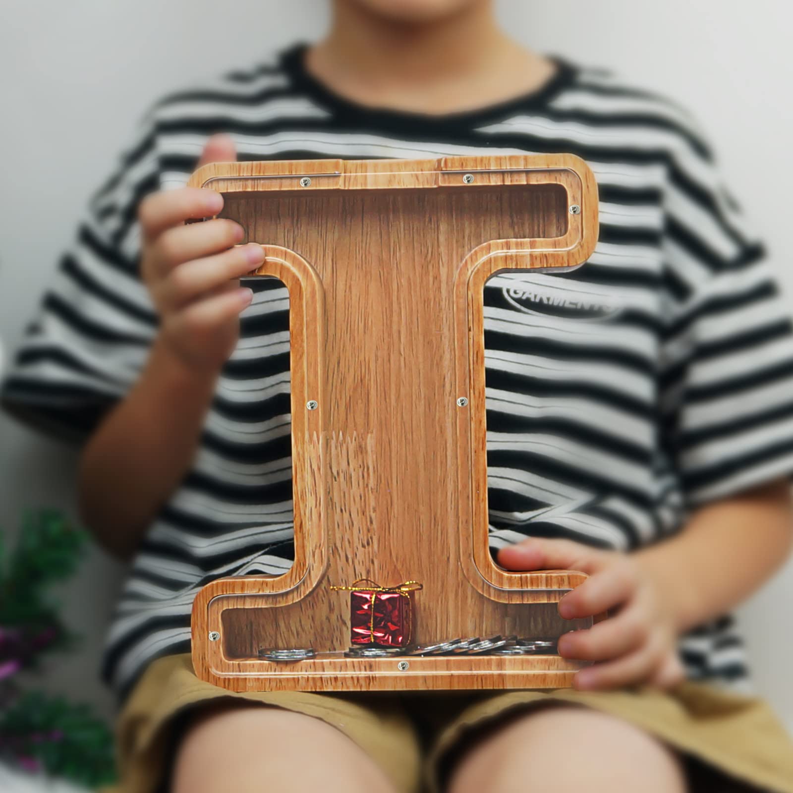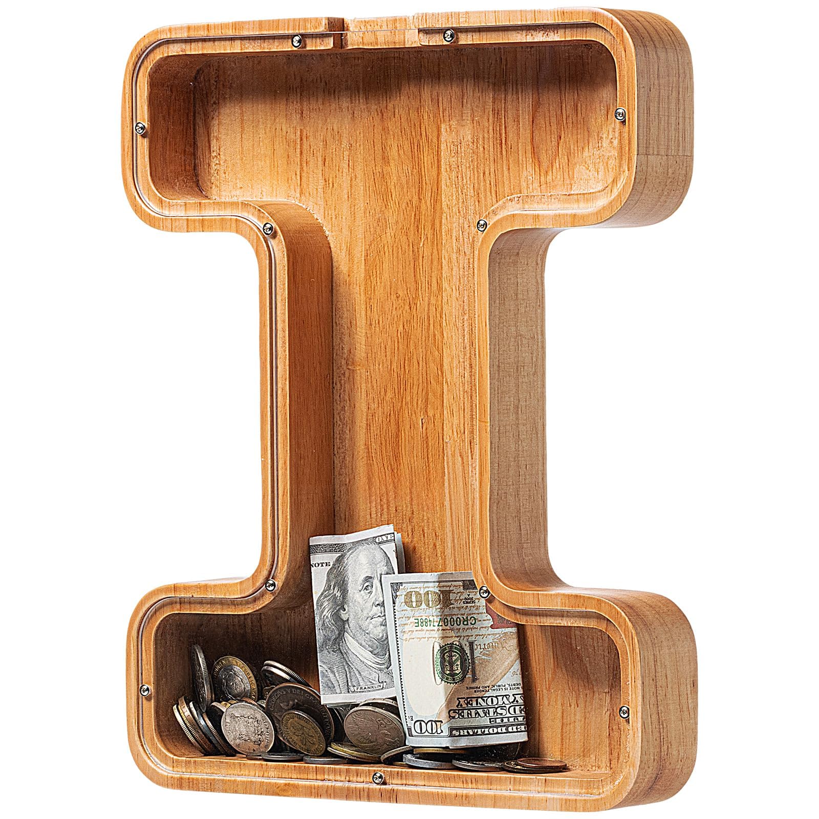 Piggy Bank For Kids Boys Girls, Large Personalized Wooden Letter Piggy Bank With Cut-Out Design, Alphabet Letter Coin Banks, Money Savings Box, Wooden Bank For Kids Creative Gift For Real-Money(I)