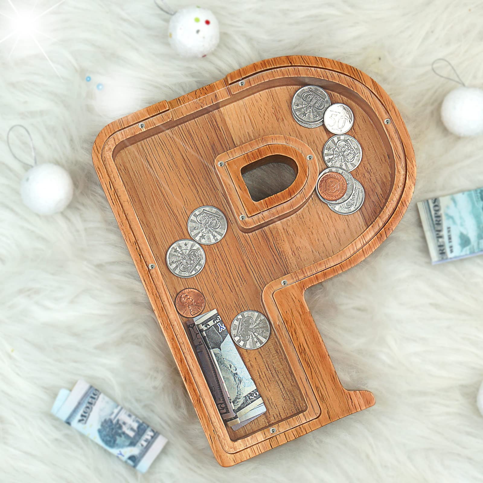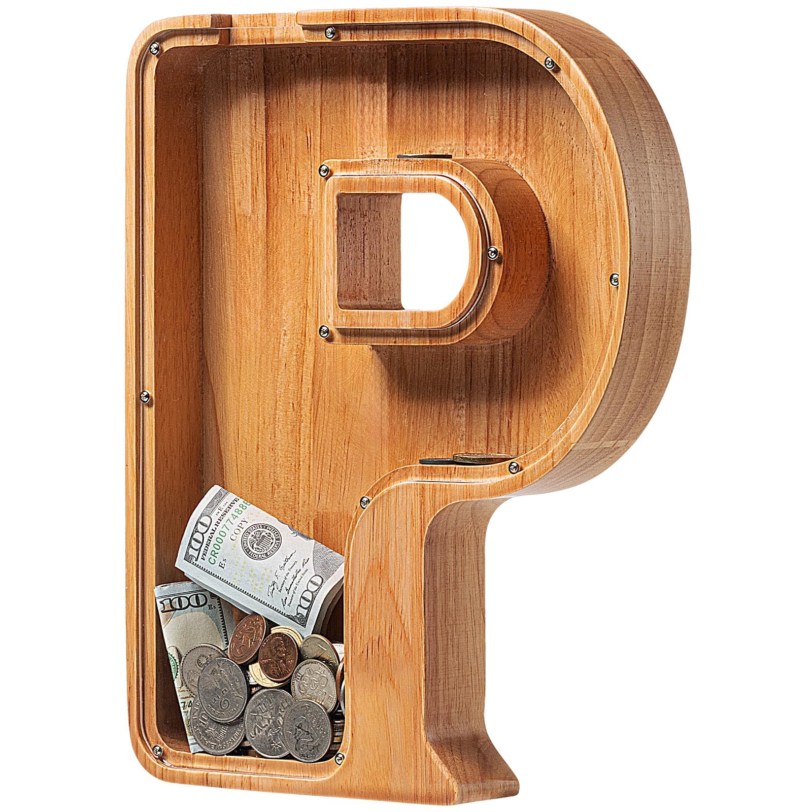 Piggy Bank For Kids Boys Girls, Large Personalized Wooden Letter Piggy Bank With Cut-Out Design, Alphabet Letter Coin Banks, Money Savings Box, Wooden Bank For Kids Creative Gift For Real-Money(P)