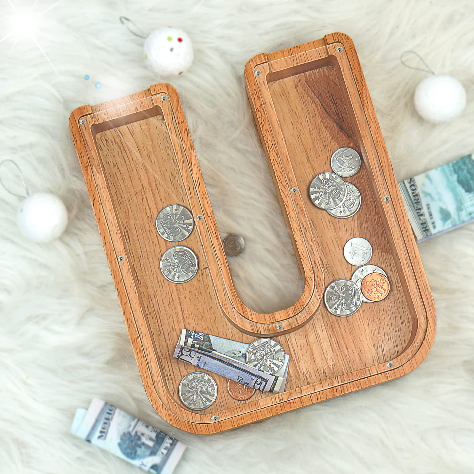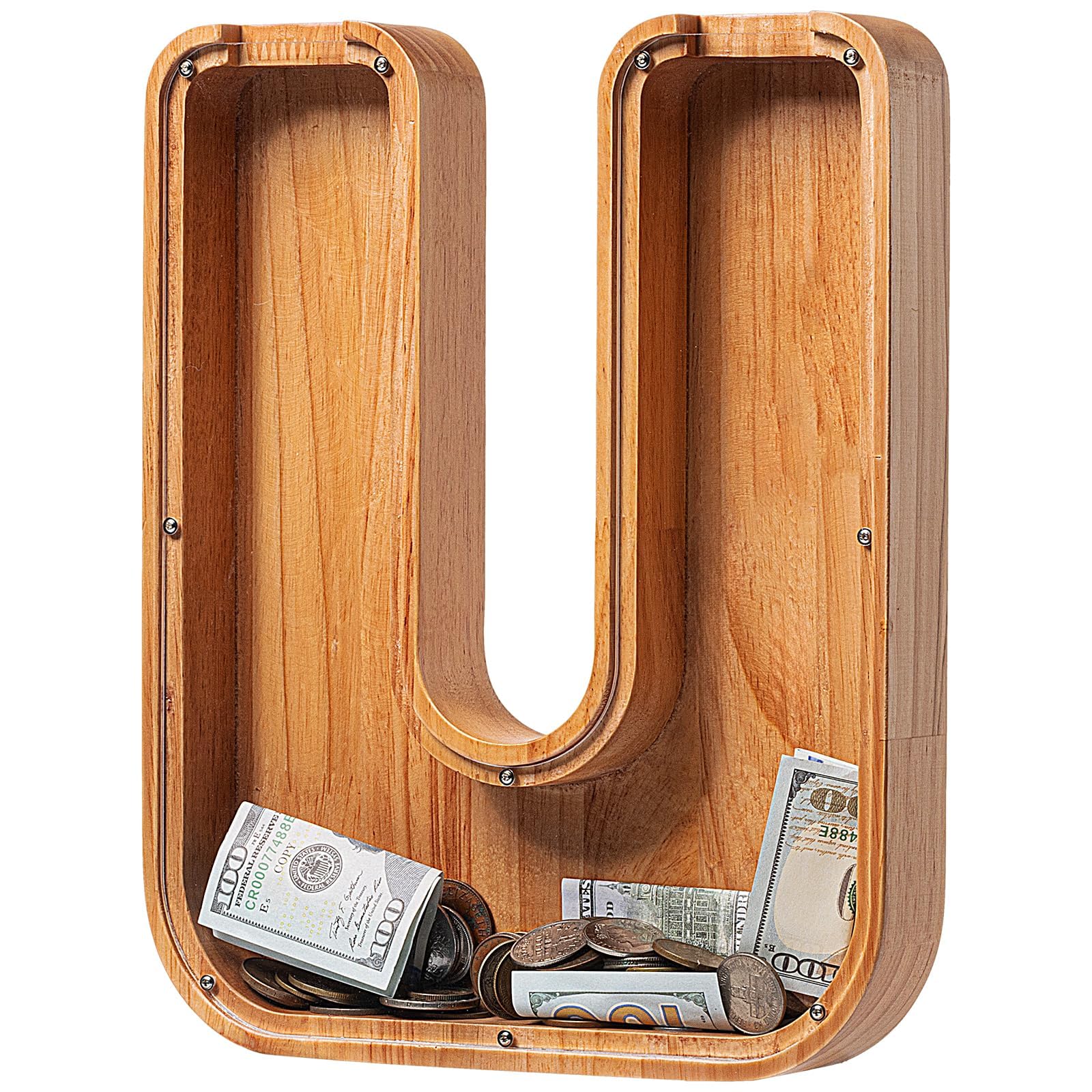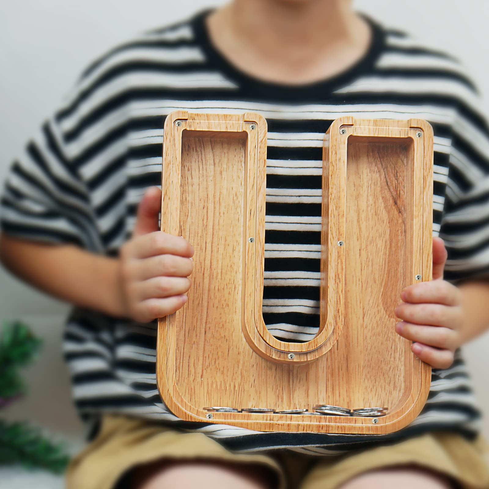Piggy Bank For Kids Boys Girls, Large Personalized Wooden Letter Piggy Bank With Cut-Out Design, Alphabet Letter Coin Banks, Money Savings Box, Wooden Bank For Kids Creative Gift For Real-Money(U)
