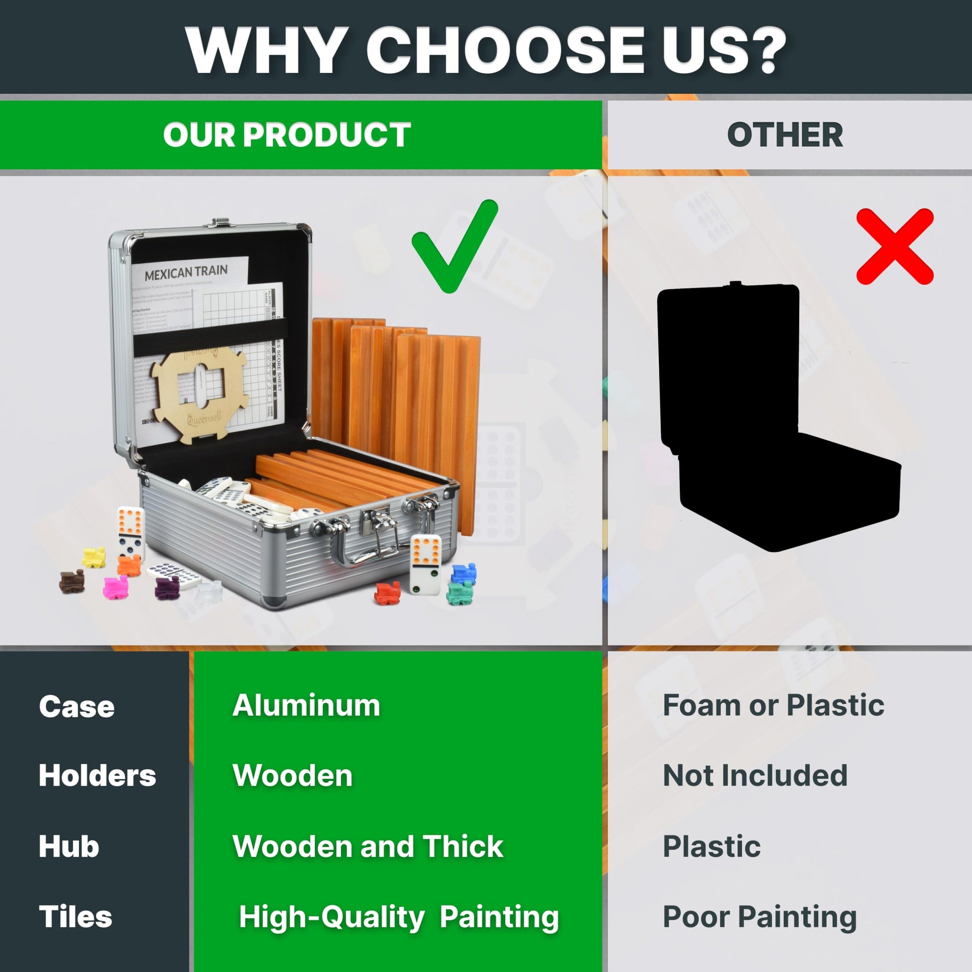 View compareQueensell Double 15 Mexican Train Dominoes Set with 8 Wooden Holders - Aluminum Hub & Tiles, Perfect for Family Game Night