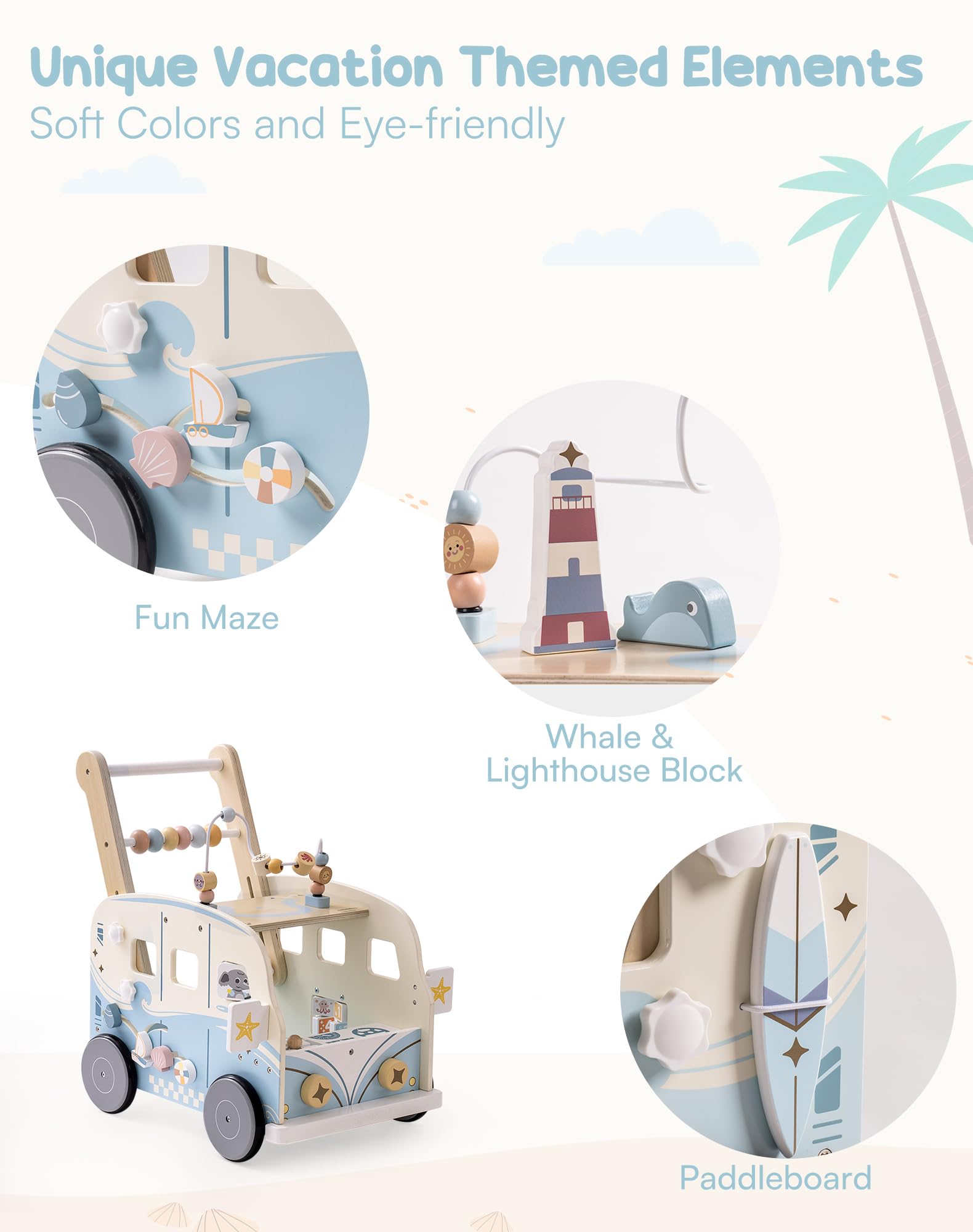 This push-pull walker comes with a wooden toy stroller, driving controls, shape sorter, and movable sliders to meet children's needs at different times.