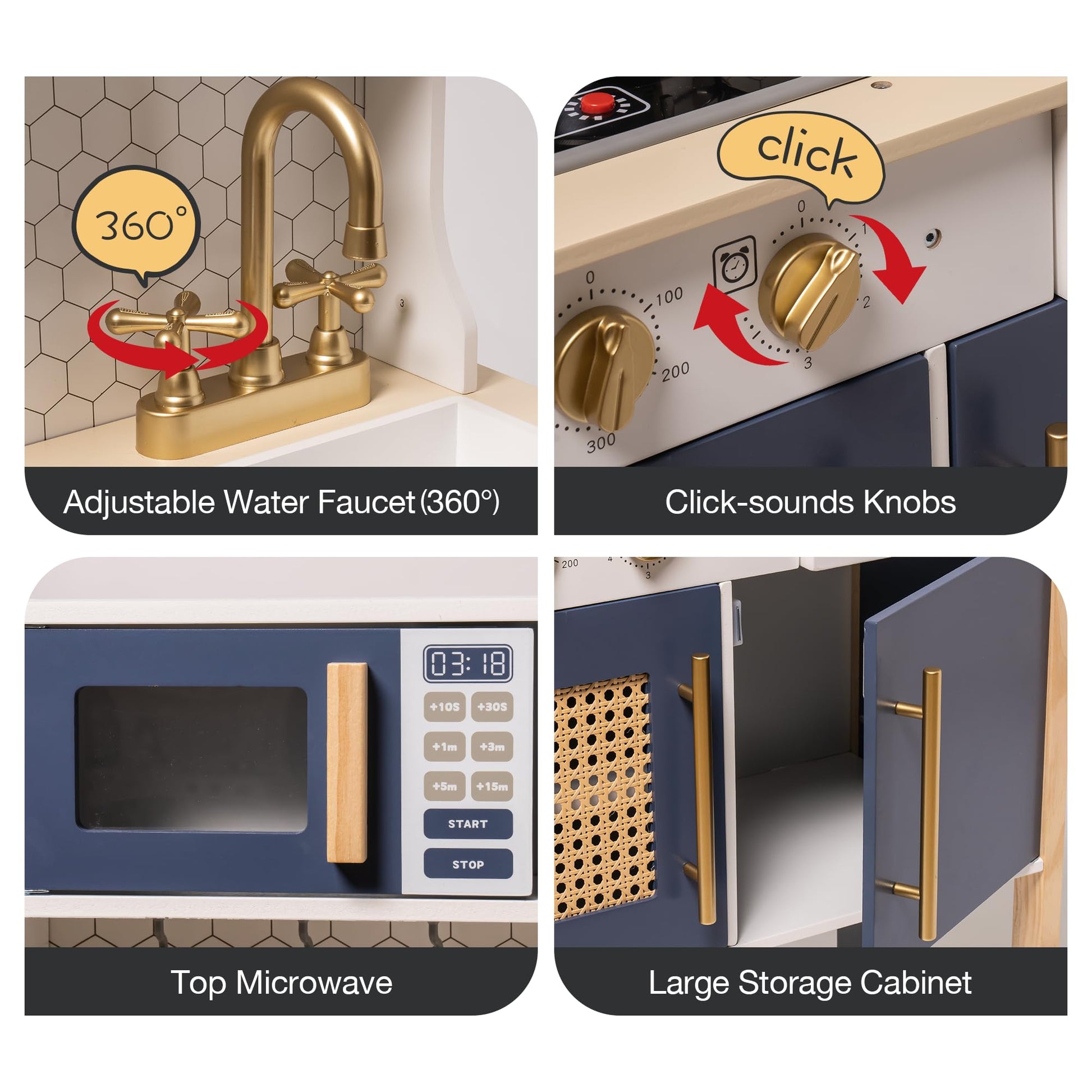• Q: Does the kitchen playset include any interactive features? A: Yes, this play kitchen features realistic sounds and lights that enhance the immersive play experience, including a 'working' microwave oven.