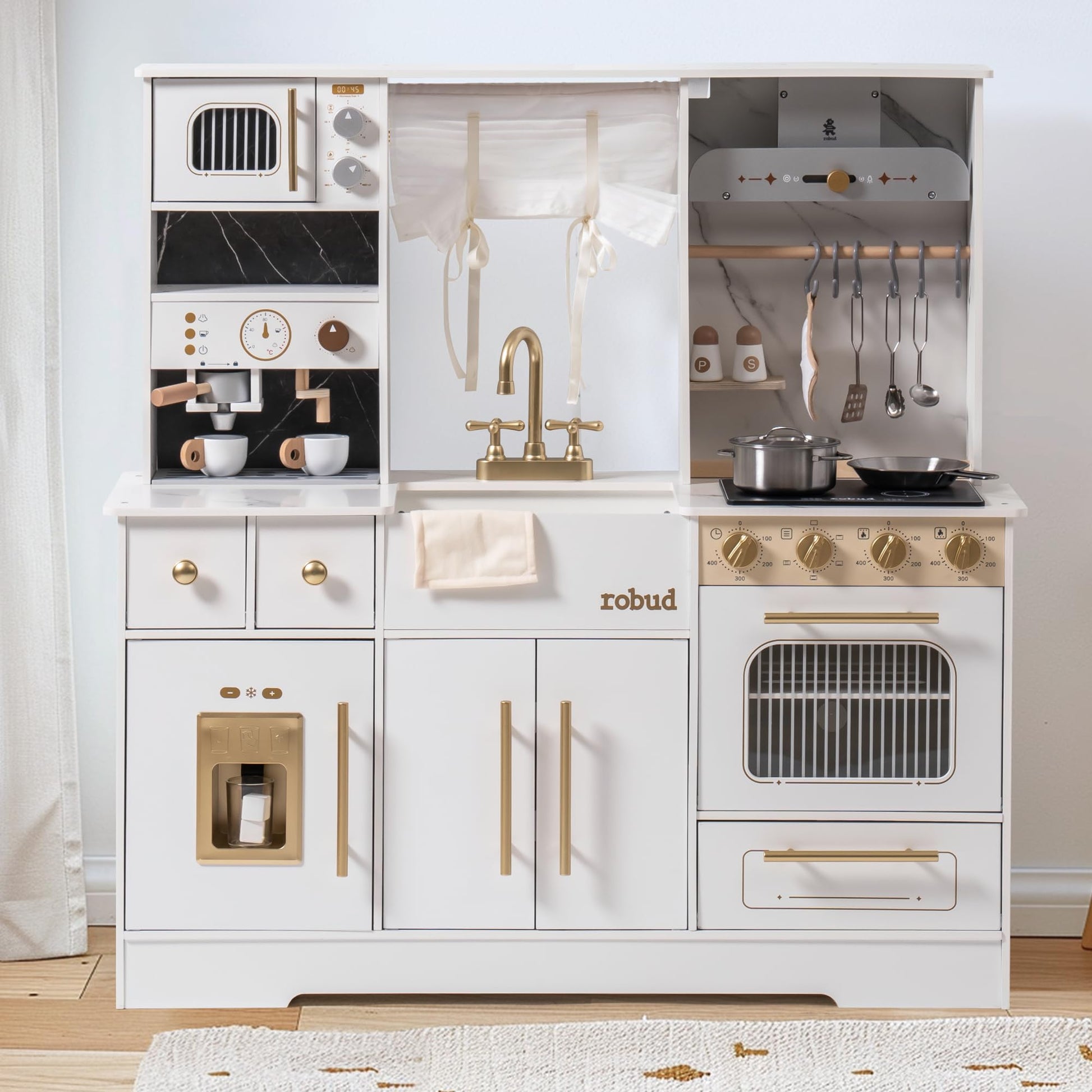 Robud Wooden Play Kitchen Set For Kids, Pretend Toy Kitchen With Ice Maker, Coffee Machine, Oven, Microwave, Cabinet, Utensils,